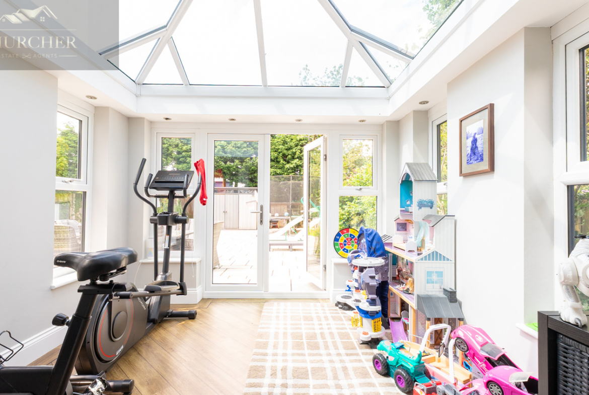 Adjoining the lounge is a stunning garden room with a vaulted glazed roof and French doors that open directly onto the rear garden. Currently used as a playroom and home gym, this bright and airy space is incredibly versatile and ideal for those seeking additional family or hobby space.