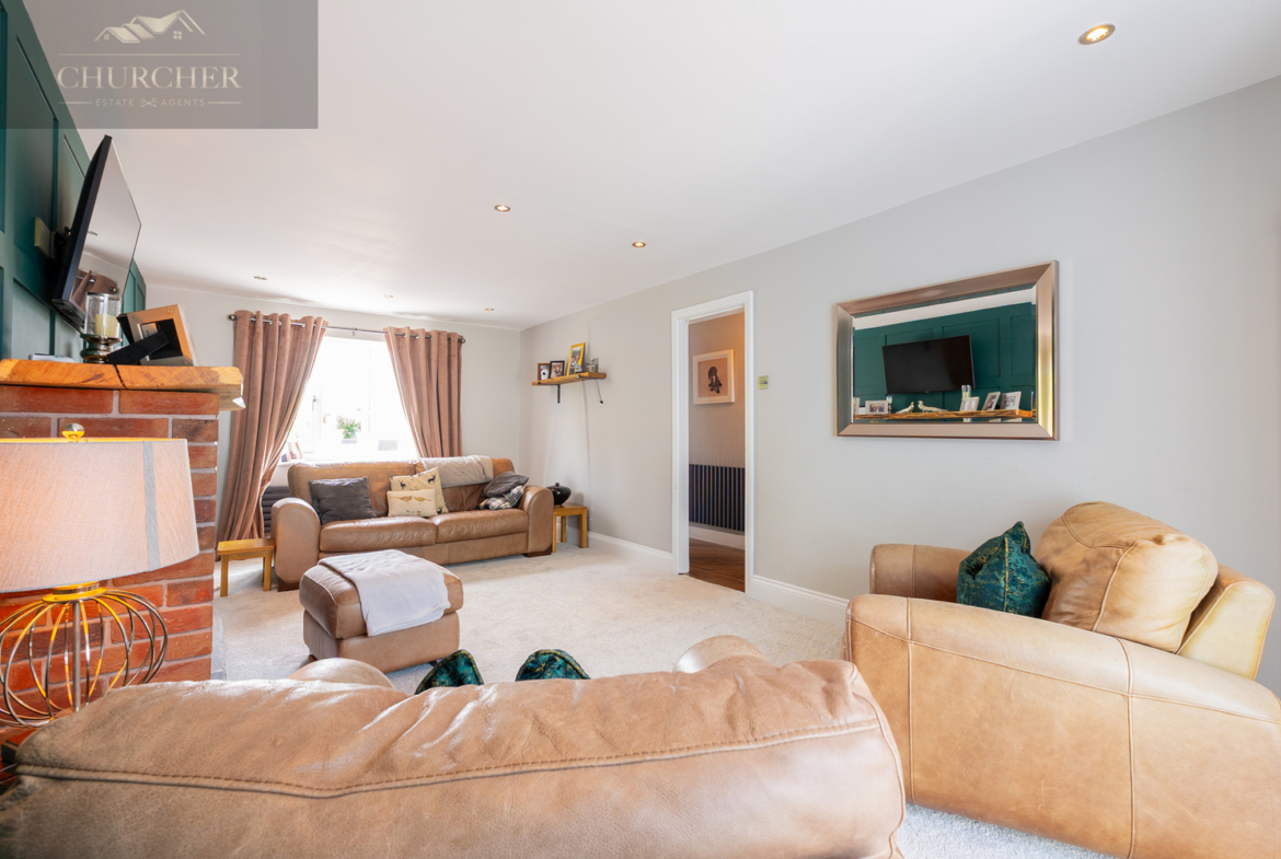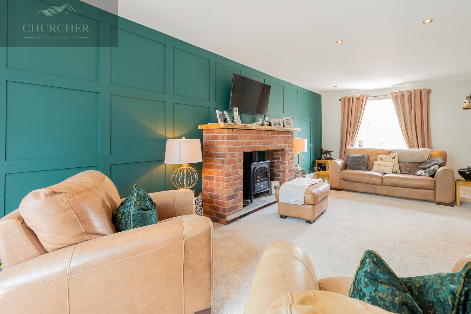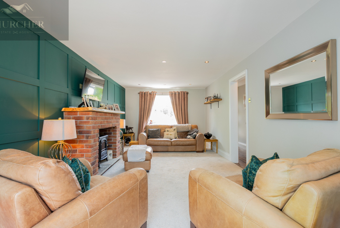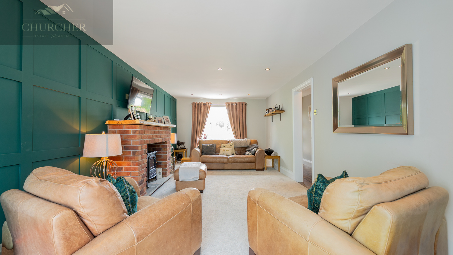 The second lounge is a beautifully designed and versatile reception room that provides a more refined space for formal entertaining or quiet relaxation. At the heart of the room is a charming exposed red brick fireplace, adding rustic character and warmth to the setting, complemented by a classic timber mantelpiece. The fireplace currently houses an electric stove-style fire, offering both ambiance and functionality without the maintenance of a real fire. A feature wall with rich, deep green panelled detailing adds a touch of elegance and visual interest, while the rest of the room is decorated in warm, neutral tones that enhance the sense of space and light. Plush carpeting underfoot provides comfort, and recessed ceiling spotlights ensure the room is perfectly lit, day or night. A large window allows an abundance of natural light to flood in, with views over the front of the property. The layout is ideal for a mix of stylish furniture, offering room for a large sofa set, occasional chairs, and media storage, making it a flexible space for families and guests alike.