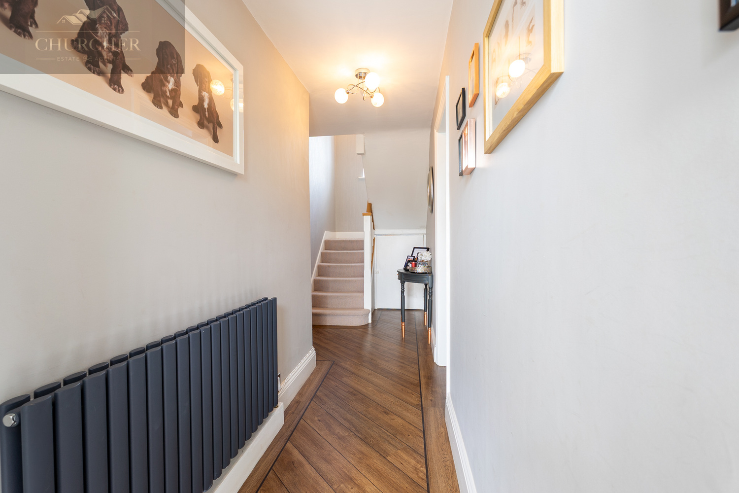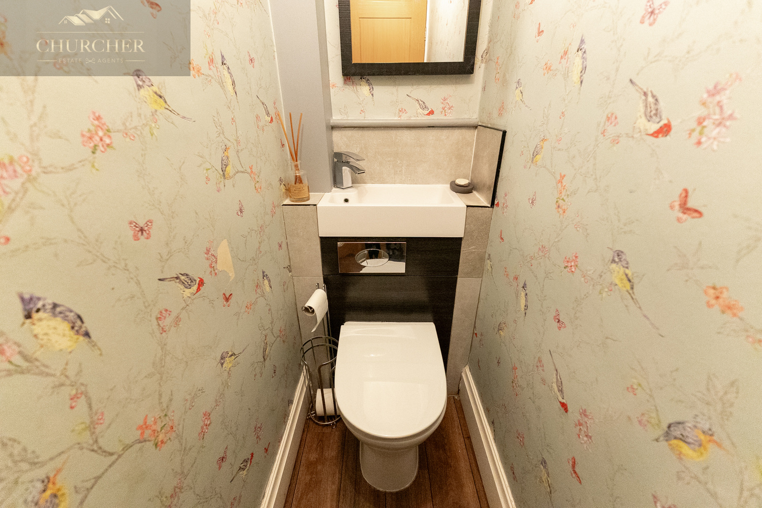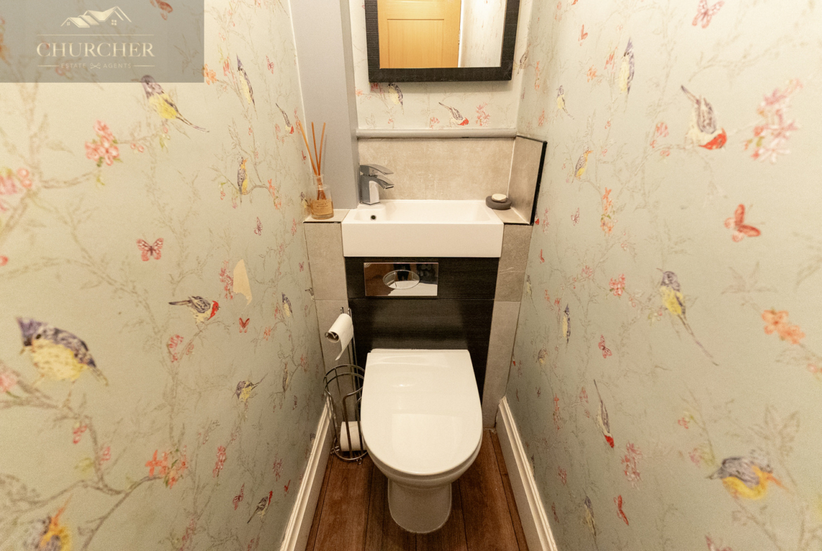 Upon entry, you’re greeted by a welcoming hallway finished with stylish wood flooring, contemporary lighting, and decorative details that set the tone for the rest of the home. A modern radiator and gallery-style wall add warmth and character, while the staircase leads you to the upper floor. Just off the hallway is a beautifully decorated cloakroom WC, featuring charming bird-themed wallpaper and a sleek combination vanity unit with integrated sink and concealed cistern.