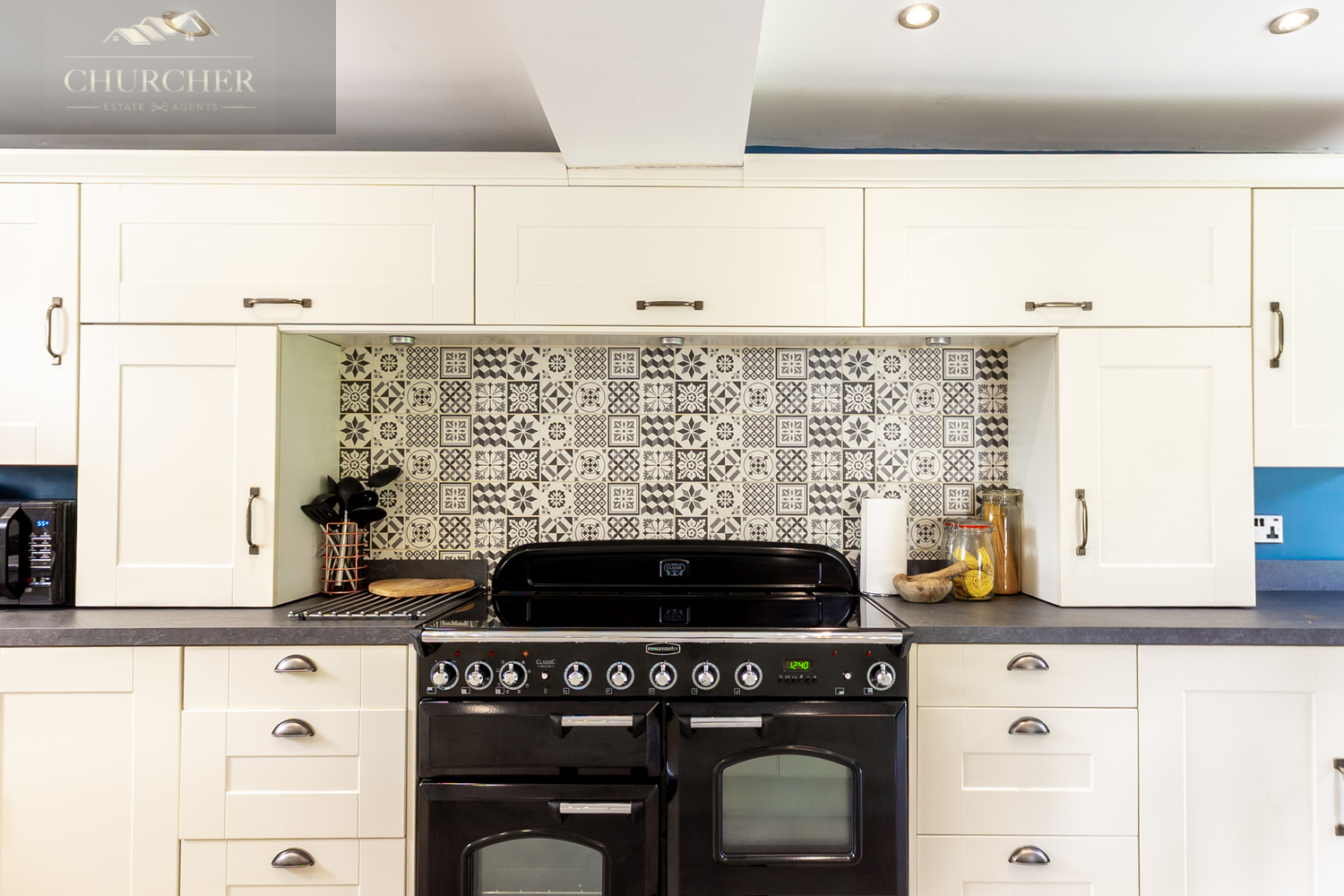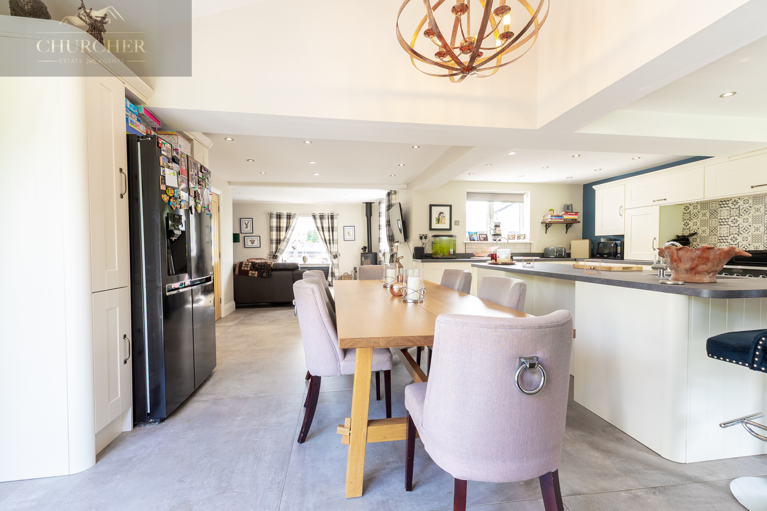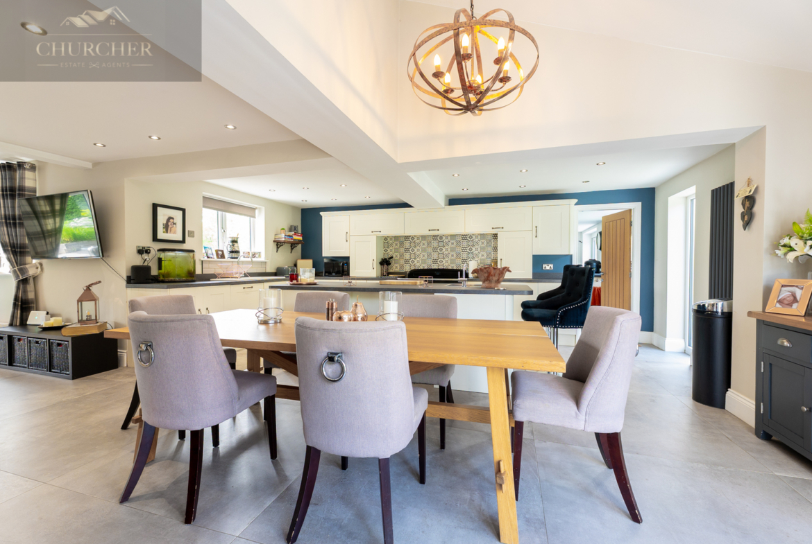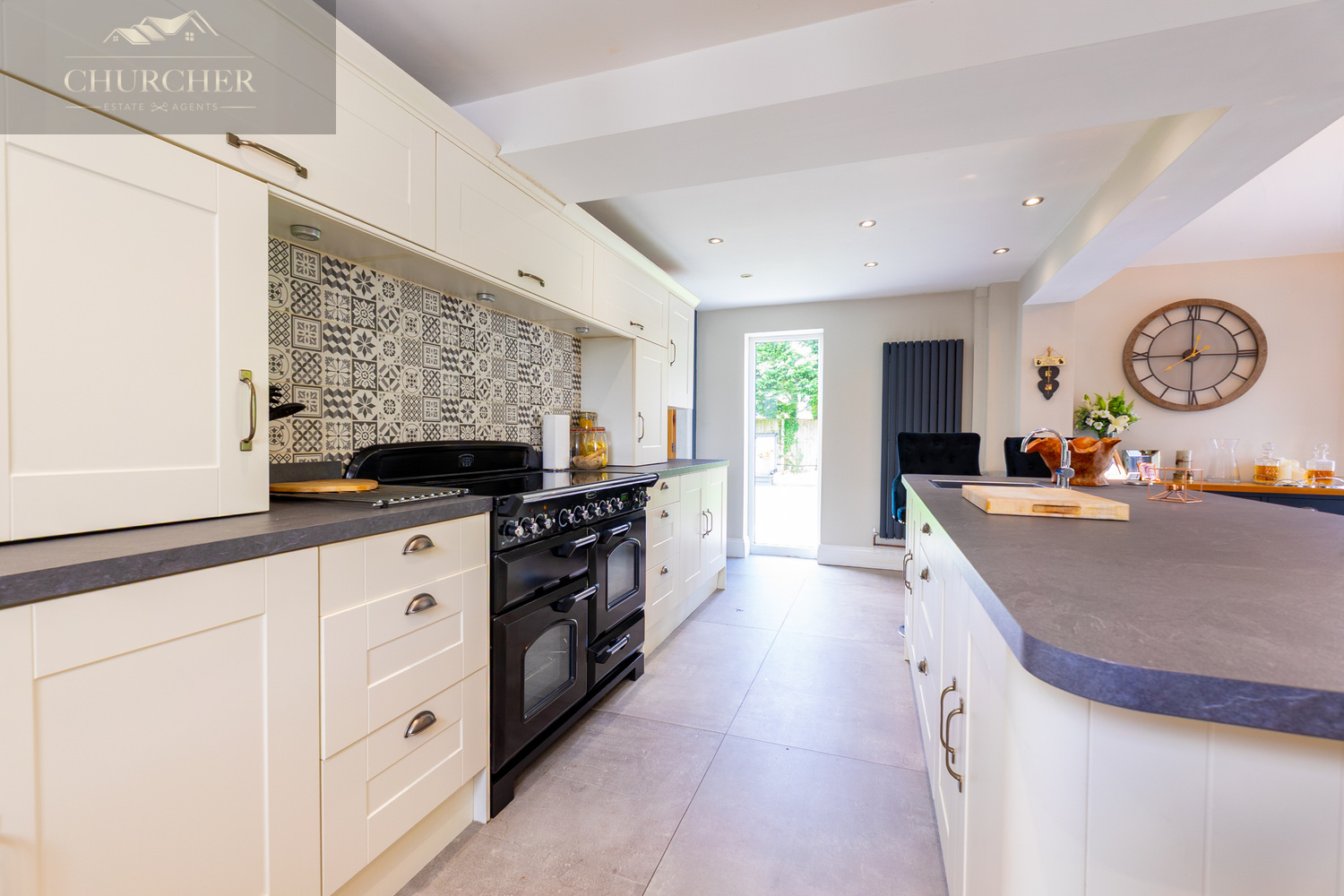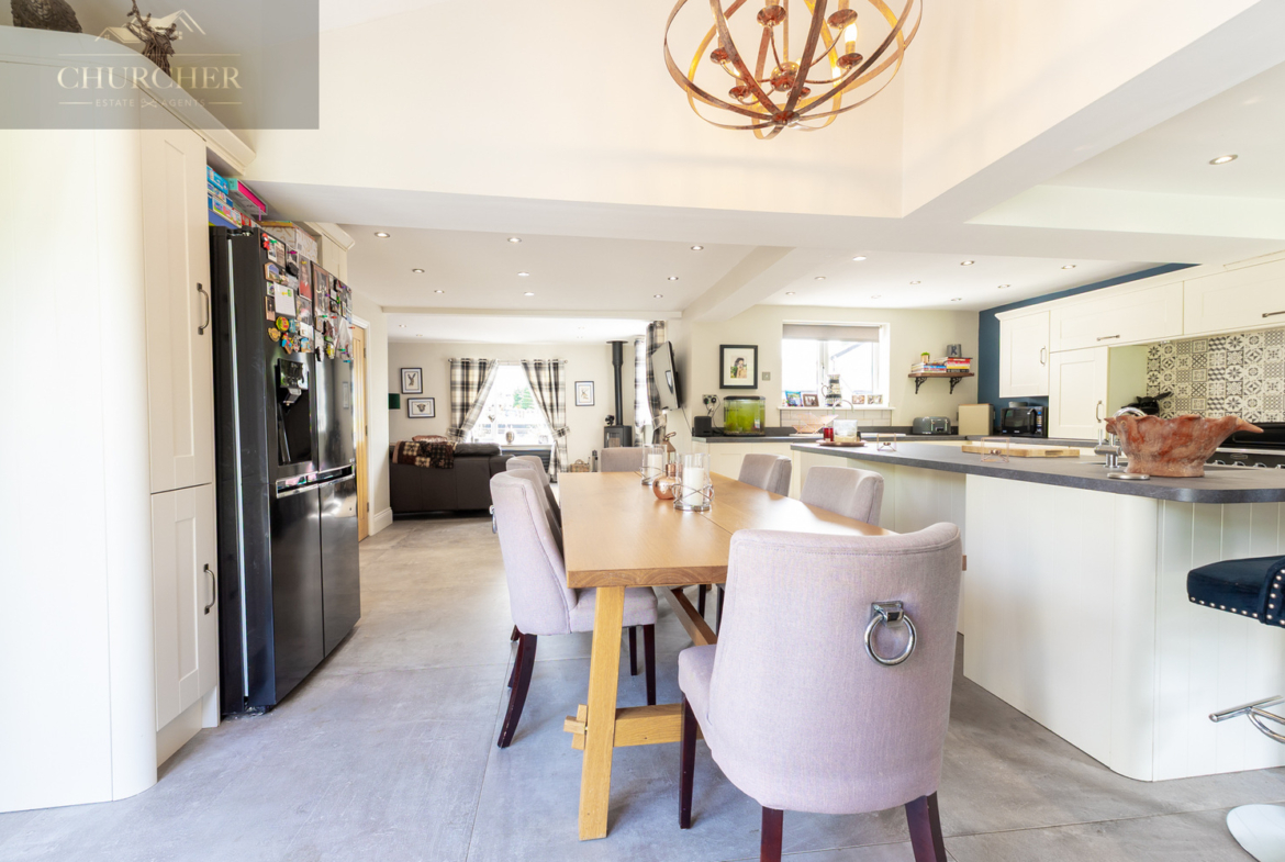 The heart of the home lies in the expansive open-plan kitchen, dining, and family room. This exceptional space blends contemporary design with traditional charm. The kitchen features shaker-style cream cabinetry, striking patterned tiled splashbacks, and a premium black range cooker nestled beneath a bespoke overmantel. The generous island provides ample prep space, a breakfast bar, and integrated sink area, seamlessly connecting to the dining area which comfortably seats eight and is framed by French doors leading to the rear patio.