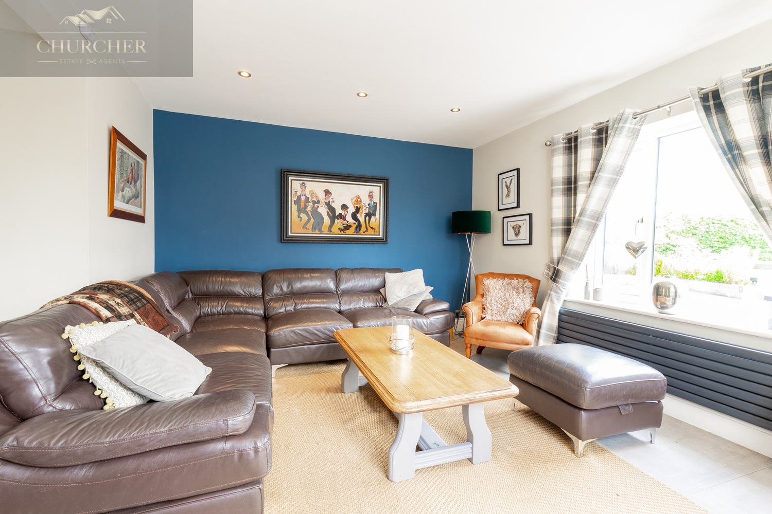 Continuing through, the family snug offers a cosy retreat, complete with a wood-burning stove set upon a black hearth, a feature navy blue accent wall, and large windows dressed with classic checkered curtains that allow natural light to pour in. Leather sofas and tasteful décor create a perfect balance of comfort and sophistication, ideal for entertaining or relaxed evenings in.