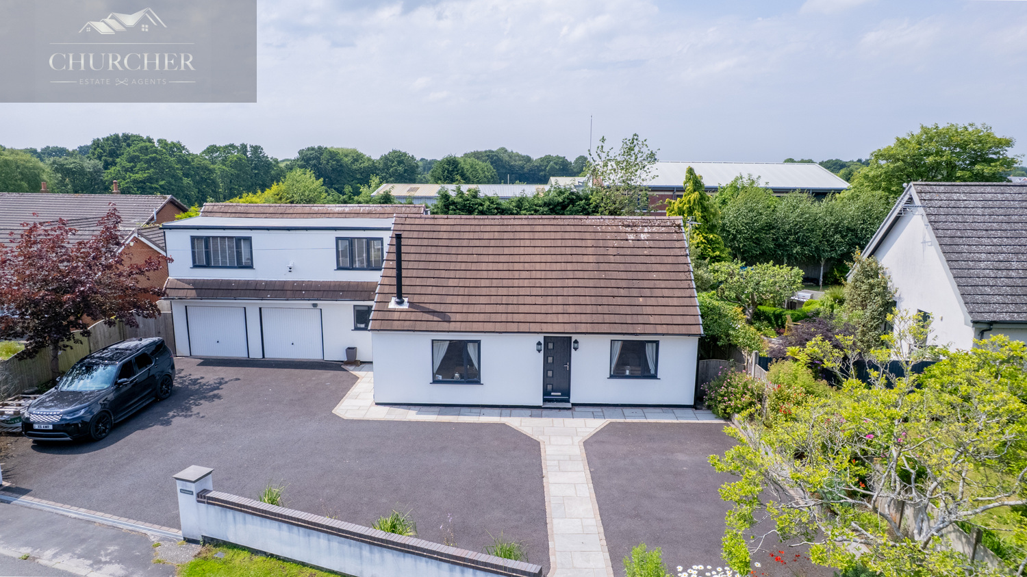 Externally, the home sits proudly on a generous plot, set well back from the road behind a charming brick wall with gated access. A wide, gravelled driveway provides extensive off-road parking for multiple vehicles and leads to an impressive double garage, offering outstanding storage, workshop potential, or scope for conversion (subject to permissions). Attractive hedging, lawned sections, and mature planting to the front elevation add privacy and kerb appeal, creating a welcoming first impression.