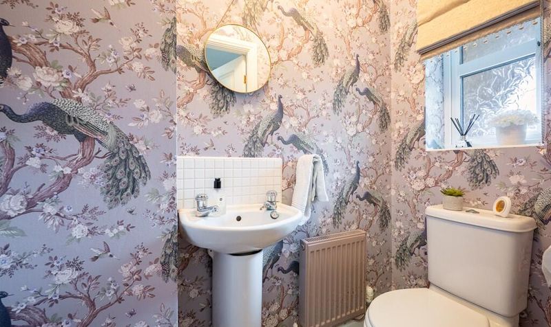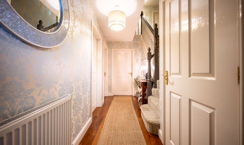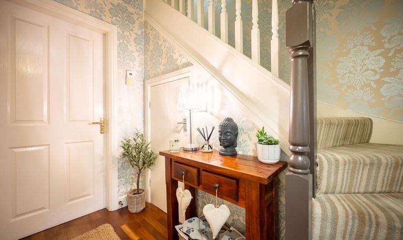 Stepping through the welcoming arched doorway, you are greeted by an inviting entrance hallway with stylish wallpaper, rich wood flooring, and a warm, homely feel that flows throughout. The hallway gives access to a modern WC and leads through to the main living spaces.