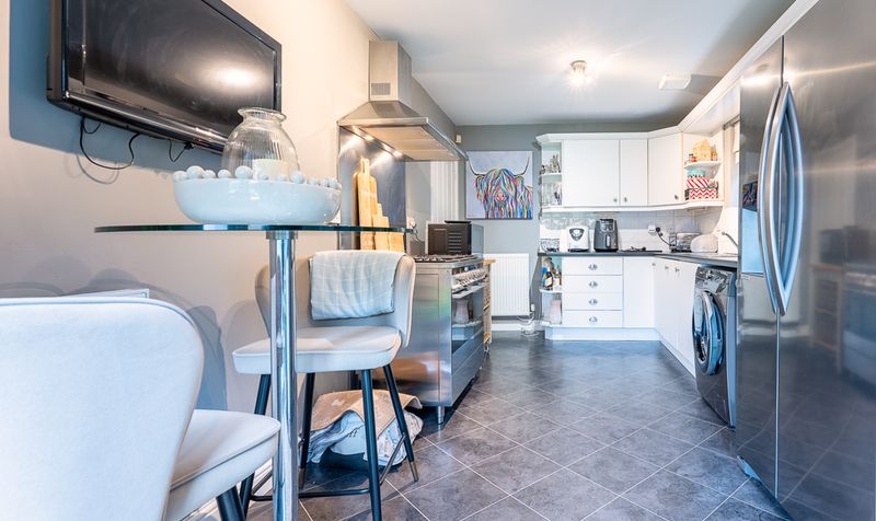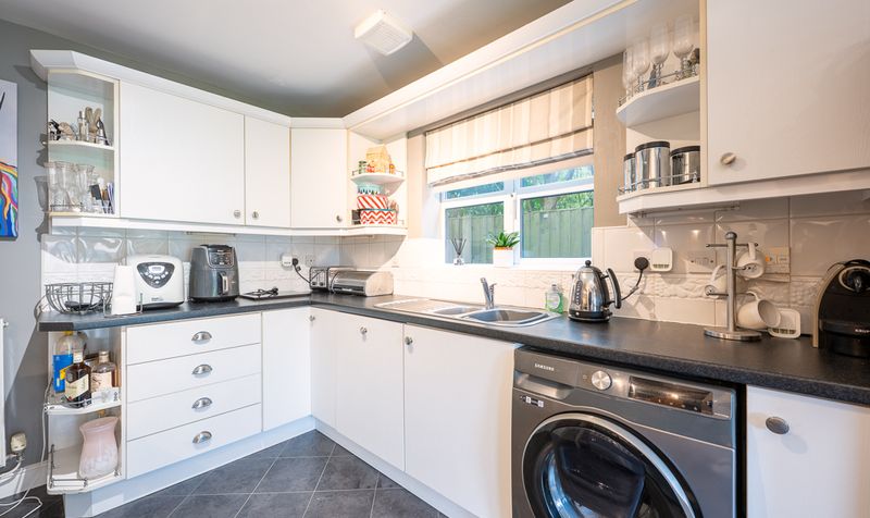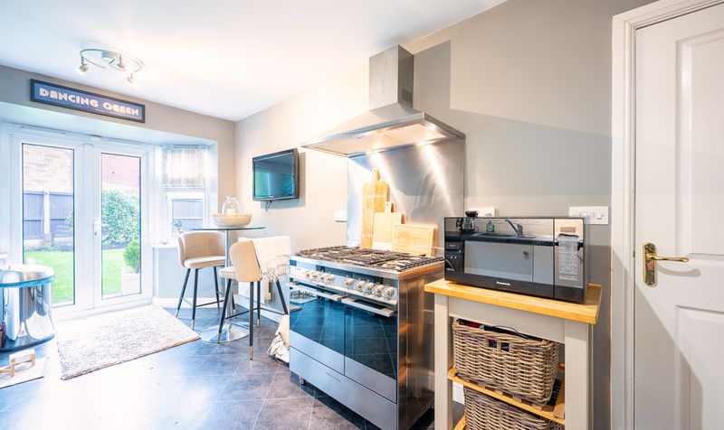 The heart of the home lies to the rear, where the spacious kitchen and dining area span the width of the property. The kitchen is fitted with a range of sleek white units and contrasting dark worktops, offering ample storage and workspace, with plenty of room for appliances. A charming breakfast area sits beside the French doors that open out to the rear garden, allowing natural light to flood the space and providing a perfect setting for everyday family life or casual entertaining.