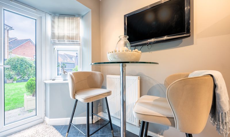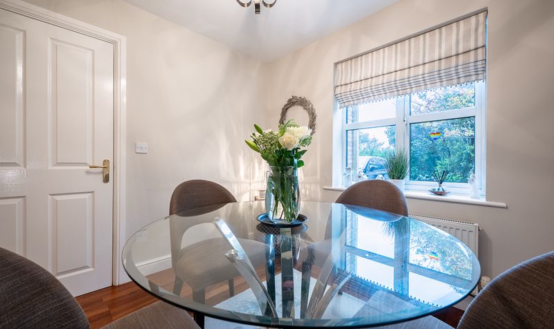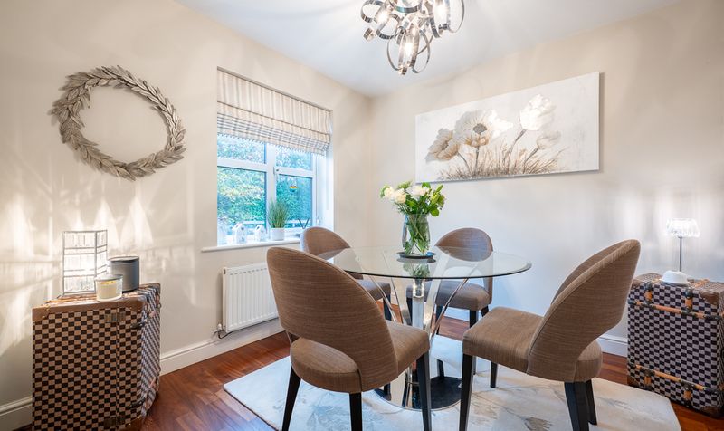 To the front of the property is a beautifully presented dining room – bright and elegant with contemporary décor and a statement light fitting, creating a sophisticated setting for family meals or entertaining guests.