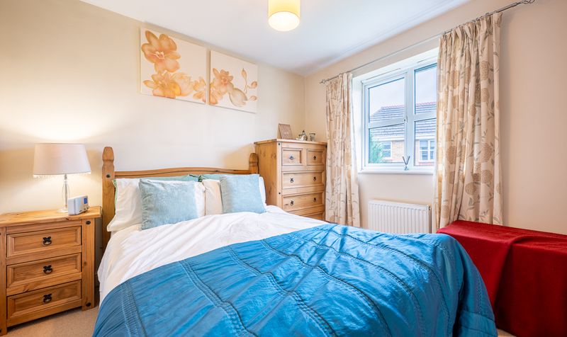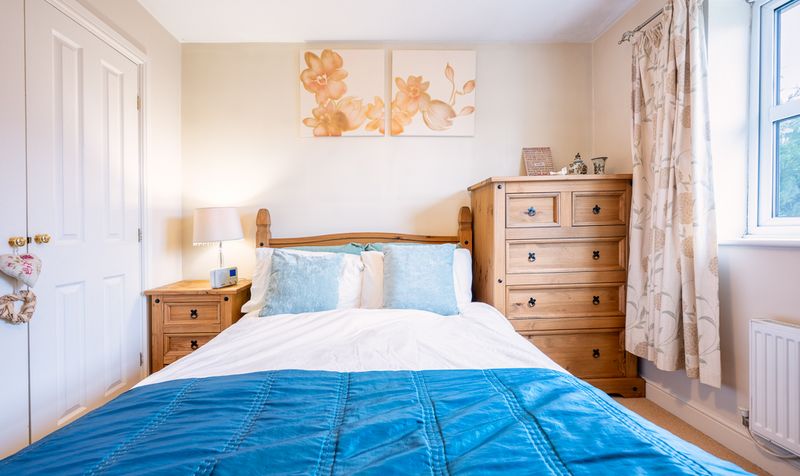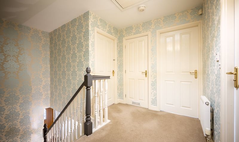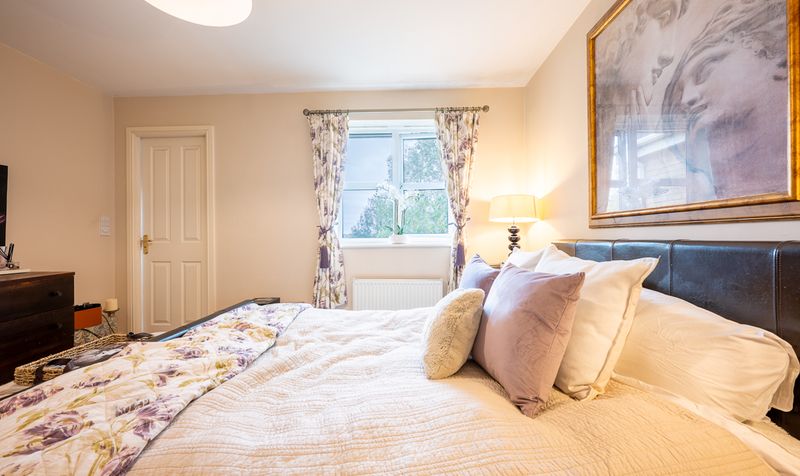 Upstairs, the landing is bright and airy, continuing the home’s elegant theme. The main bedroom is a truly impressive and tranquil retreat, designed with comfort and relaxation in mind. Generously proportioned, it easily accommodates a large bed along with additional furnishings, while tasteful décor and soft natural light enhance its calm, restful atmosphere. This room provides the perfect sanctuary at the end of a busy day.