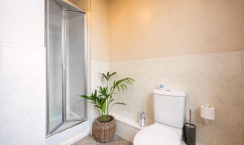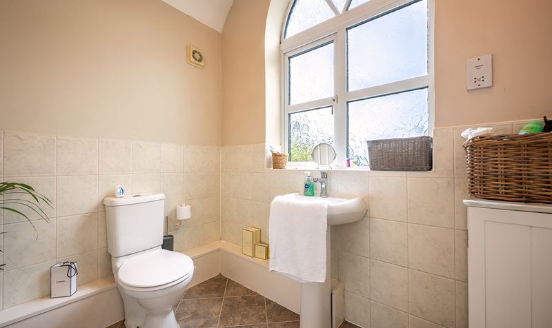 The beautifully appointed en-suite adds a real touch of luxury to the home. Featuring a modern tiled shower enclosure, sleek glass doors, and a contemporary white suite with a pedestal wash basin and WC, the space is both practical and stylish. A stunning arched window becomes a focal point, flooding the room with natural light and enhancing the bright, airy feel. With elegant tiling, subtle neutral tones, and a sense of privacy and calm, the en-suite offers a spa-like experience.