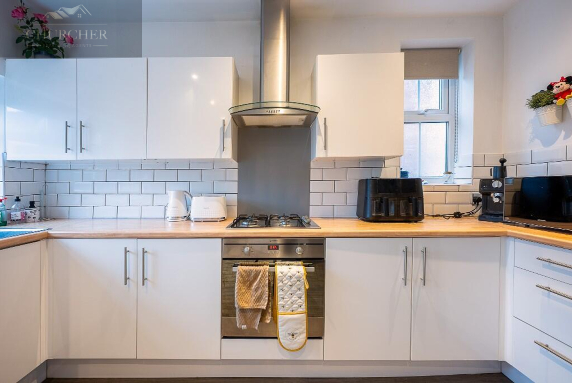 Continuing through, the spacious kitchen and dining area provide the perfect setting for family meals and entertaining guests. The kitchen is fitted with sleek white gloss units, subway tiled splashbacks, and wooden worktops, complemented by an integrated oven and hob with a stylish stainless-steel extractor. Dual aspect windows flood the room with light, and there is ample space for a dining table, making it a sociable heart of the home. A handy under-stair storage cupboard offers practicality and convenience.