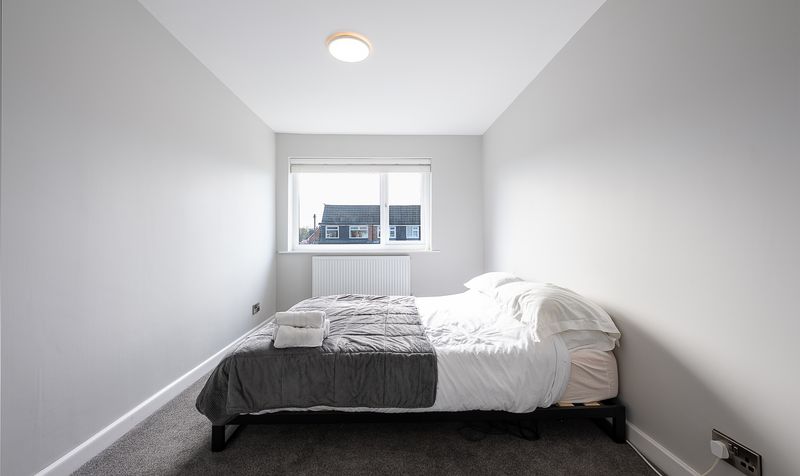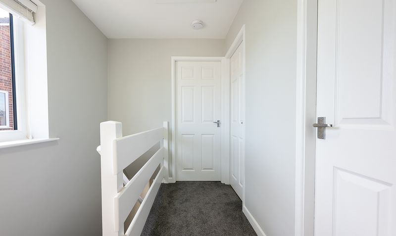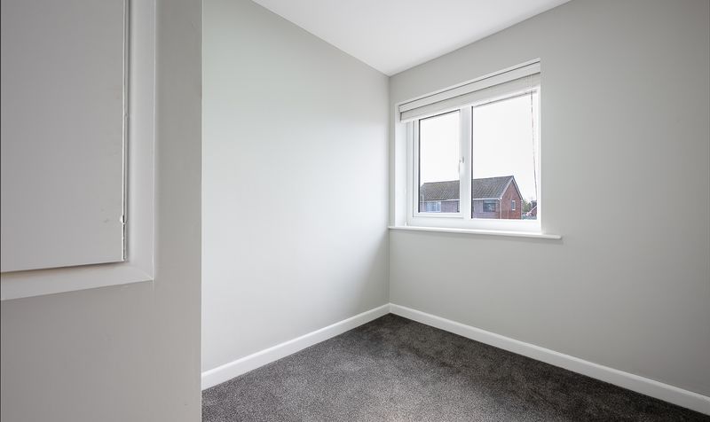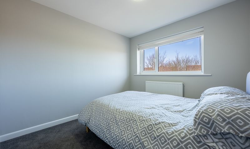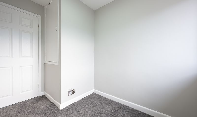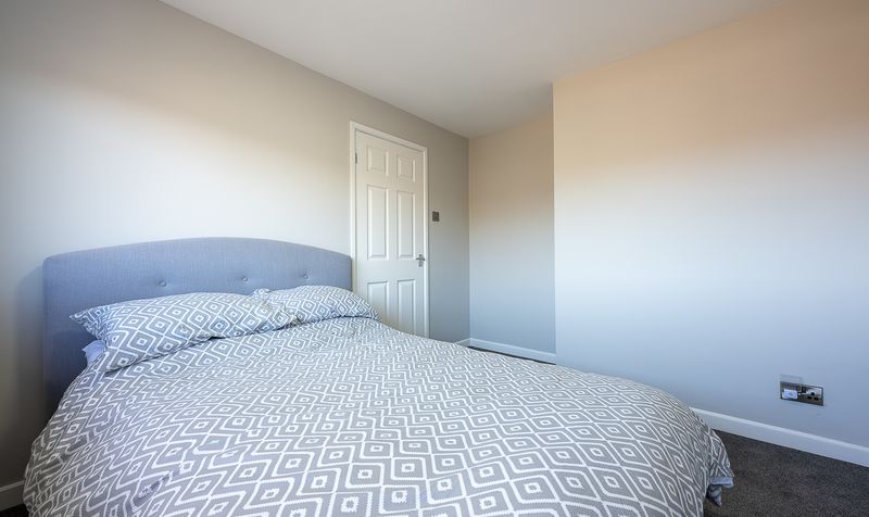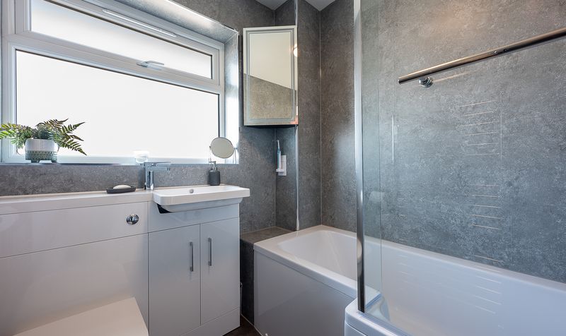 Upstairs, the bright landing leads to three well-presented bedrooms. The principal bedroom offers a calm, restful space with a neutral colour palette, while the second bedroom provides a generous double with views over the rear garden. The third bedroom offers flexibility as a child’s room, home office, or guest space. The stylish family bathroom is beautifully appointed with a modern white suite, bath with overhead shower, vanity unit with storage, chrome towel radiator, and contemporary wall panelling for a sleek finish.