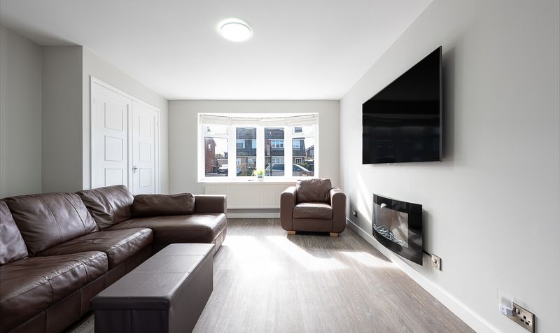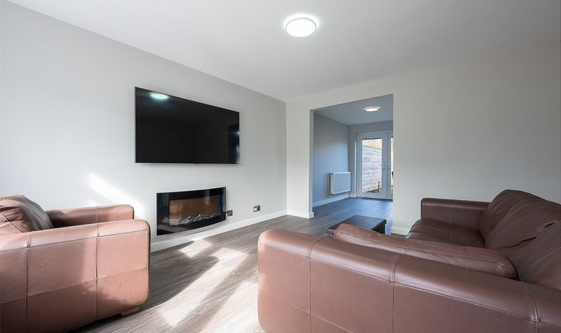 Upon entering through the bright and welcoming porch, you are greeted by a modern hallway that sets the tone for the quality throughout, with soft neutral décor and high-quality flooring continuing across the ground floor. To the front, the spacious living room features a large bay window flooding the space with natural light, while a wall-mounted electric fire provides a contemporary focal point, creating a warm and relaxing atmosphere.
