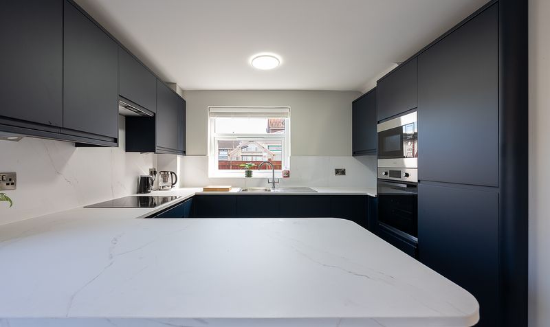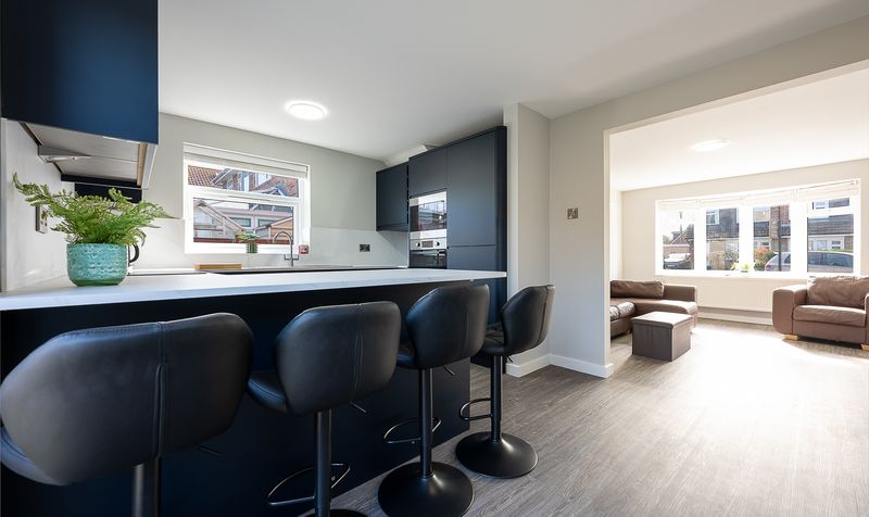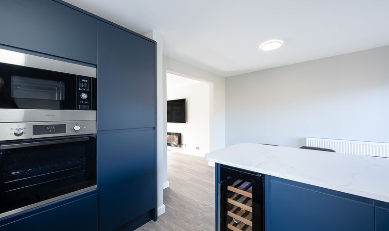 The living room flows seamlessly into the stunning open-plan kitchen and dining area – the true heart of the home. The kitchen is fitted with sleek navy cabinetry and luxurious laminate marble-effect worktops that perfectly capture the look of real stone, paired with integrated appliances including an oven, hob, extractor, microwave, and a stylish wine cooler. Under-cabinet and plinth lighting add an elegant touch, while the breakfast bar provides a social hub for casual dining. French doors open directly onto the rear garden, creating a wonderful indoor-outdoor flow ideal for entertaining.