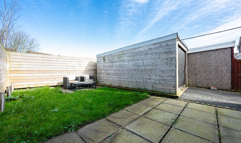 Externally, the property enjoys a low-maintenance frontage with a decorative blue slate driveway providing ample off-road parking and leading to a detached garage. To the rear, the enclosed garden features a neatly kept lawn and paved patio area – perfect for summer relaxation or entertaining.