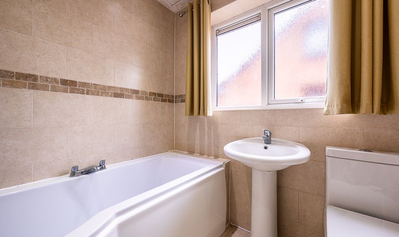 The bathroom is fitted with a modern three-piece suite comprising a bath with shower over, wash basin and WC, complemented by tiled walls and a frosted window for privacy.