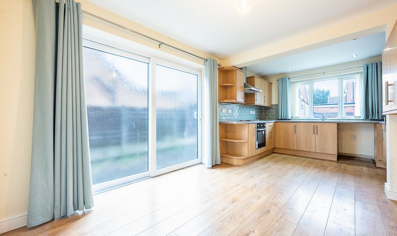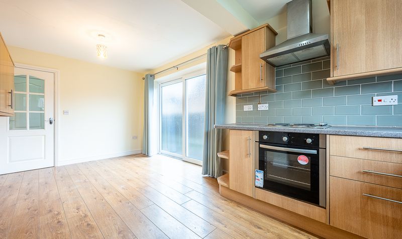 To the rear of the property, the kitchen diner offers a practical and sociable layout with fitted wall and base units, complementary work surfaces, integrated oven and hob, and ample space for dining. Sliding doors lead out to the patio area, making this an ideal spot for summer dining or enjoying the garden outlook.
