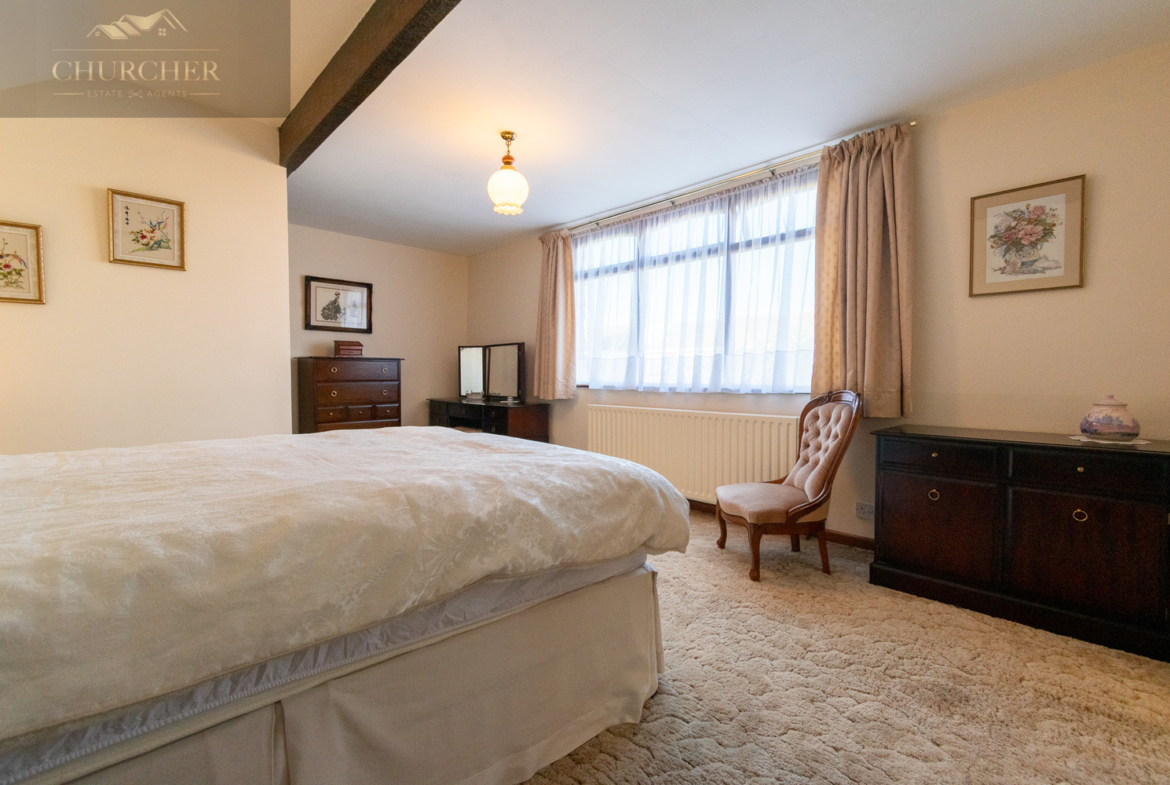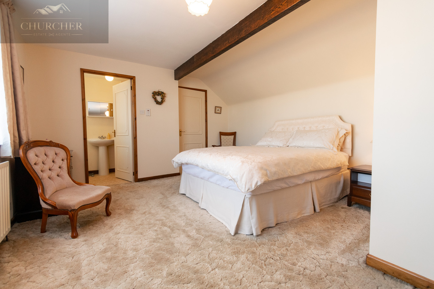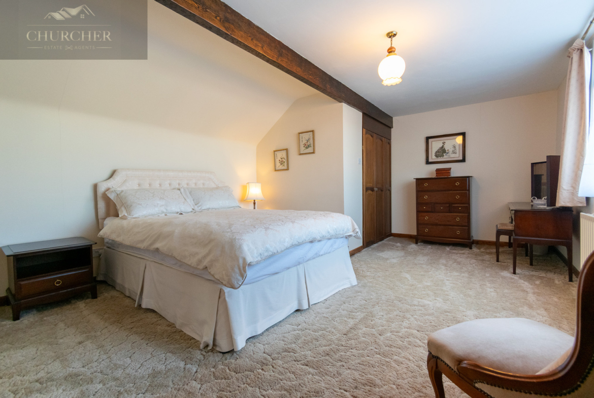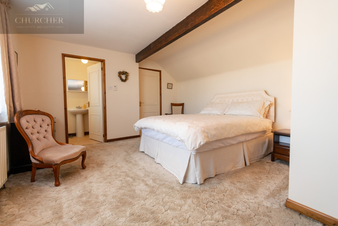 Ascending the staircase, the upper floor is dedicated to a generous main bedroom suite that provides a peaceful retreat from the rest of the home. This impressive space features exposed timber beams, a sloped ceiling adding to its character, and a lovely sense of light from a large window. A particularly notable feature is the very large walk-in wardrobe with extensive hanging space, offering excellent storage and organisation. There remains ample room for additional furnishings, while the adjoining en-suite shower room provides convenience and privacy, fitted with a walk-in shower, WC, and wash basin.