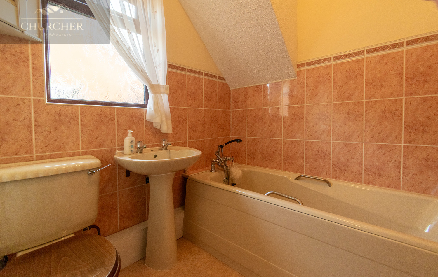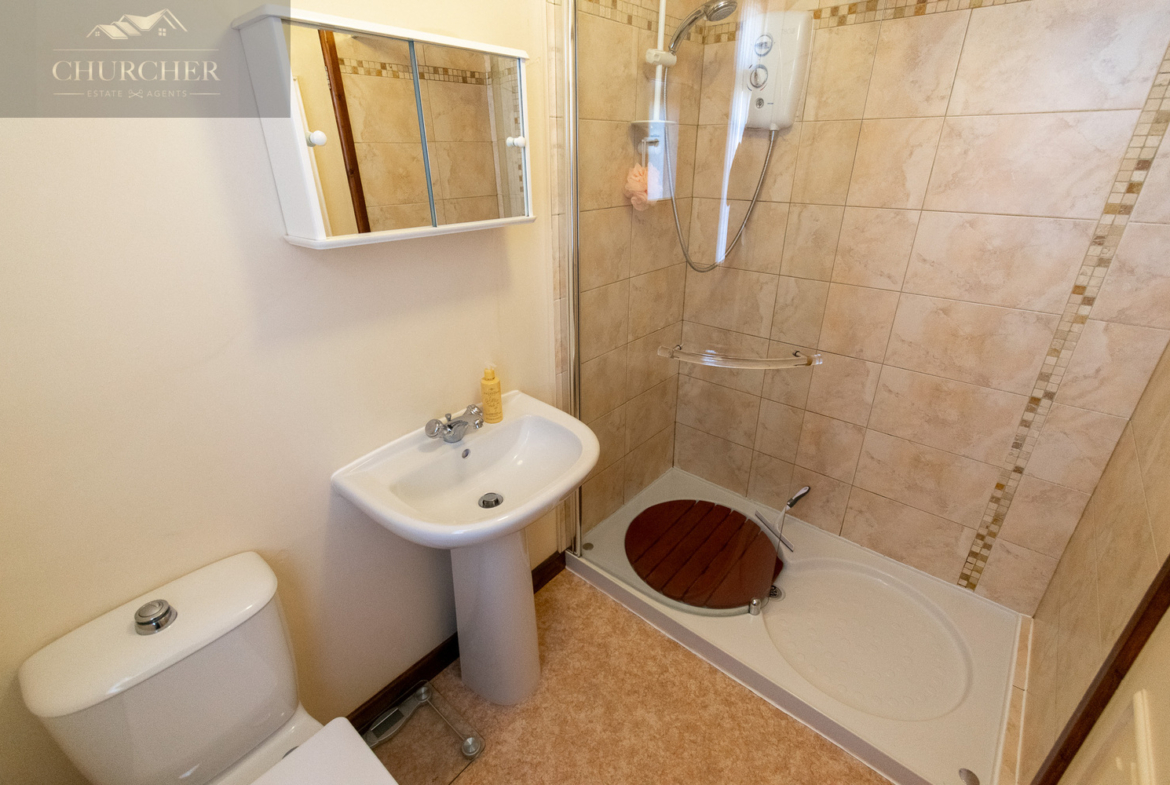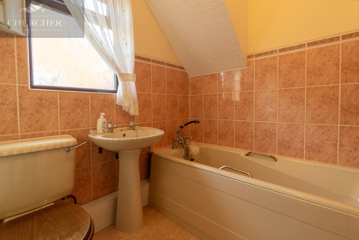 The ground floor bathroom is neatly presented and fitted with a traditional three-piece suite including a panelled bath with shower attachment, pedestal wash basin, and low-level WC. Softly tiled and well-kept, it serves the home perfectly.