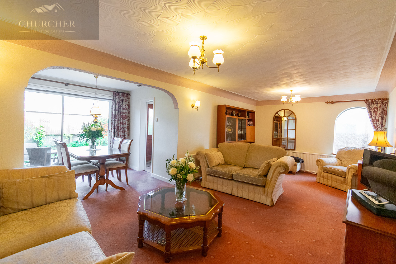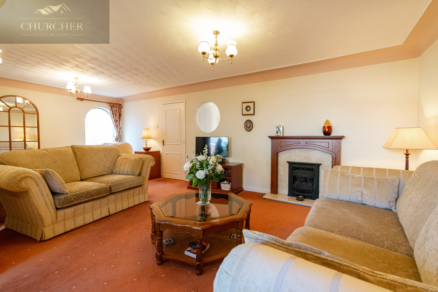 Upon entering, you are greeted by a spacious and light-filled hallway that sets the tone for the home’s inviting and well-kept interior. This welcoming space also benefits from a large built-in storage cupboard, ideal for coats, shoes, or household items, ensuring the entrance remains neat and organised. From here, you step into the main lounge – an impressively sized room that immediately conveys a sense of comfort and charm. The large window floods the space with natural light, complementing the soft neutral tones and elegant ceiling detailing. The central fireplace provides a lovely focal point, creating a cosy setting for relaxing evenings, while the open archway to the dining area ensures a seamless flow through the ground floor.