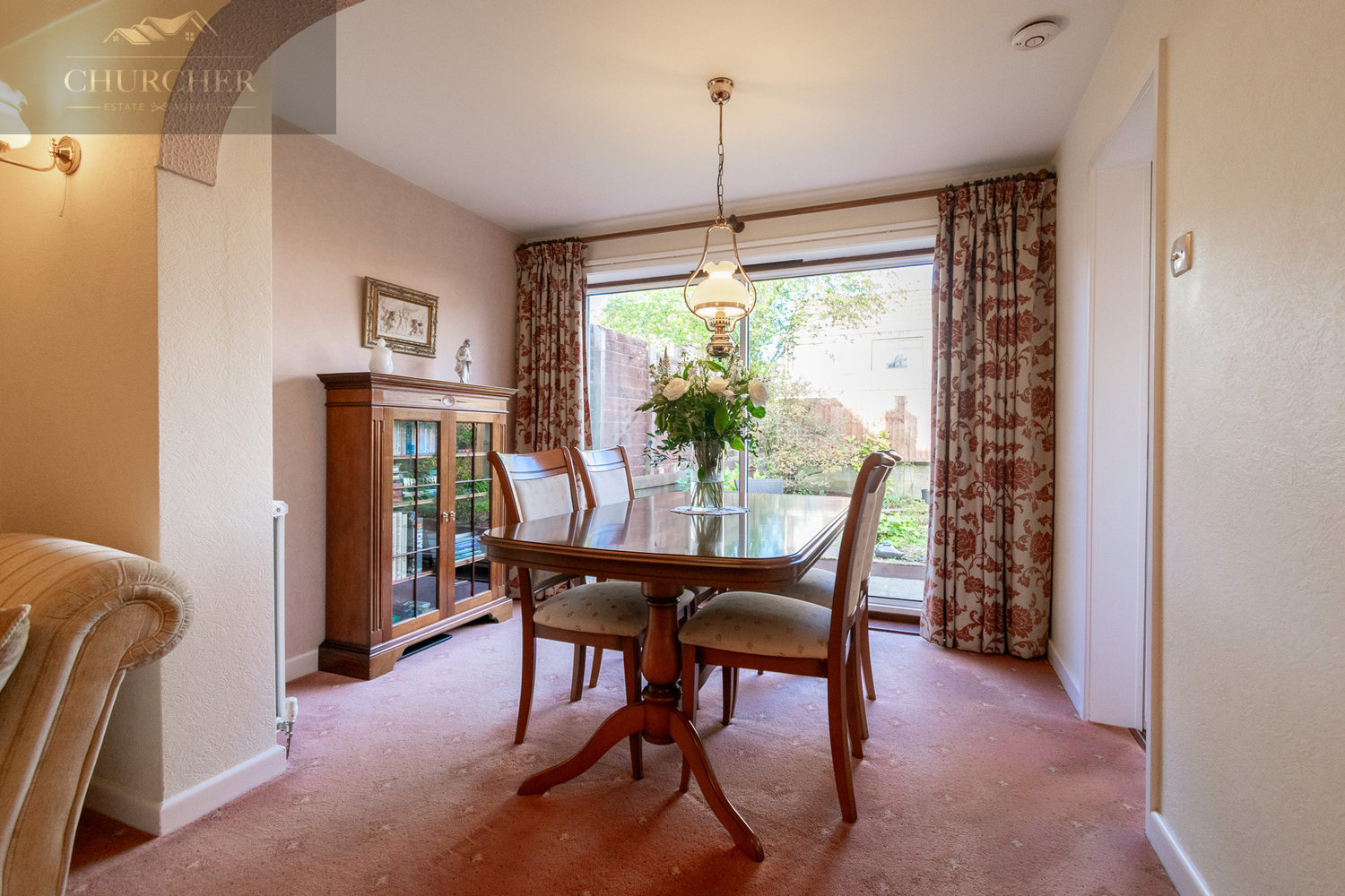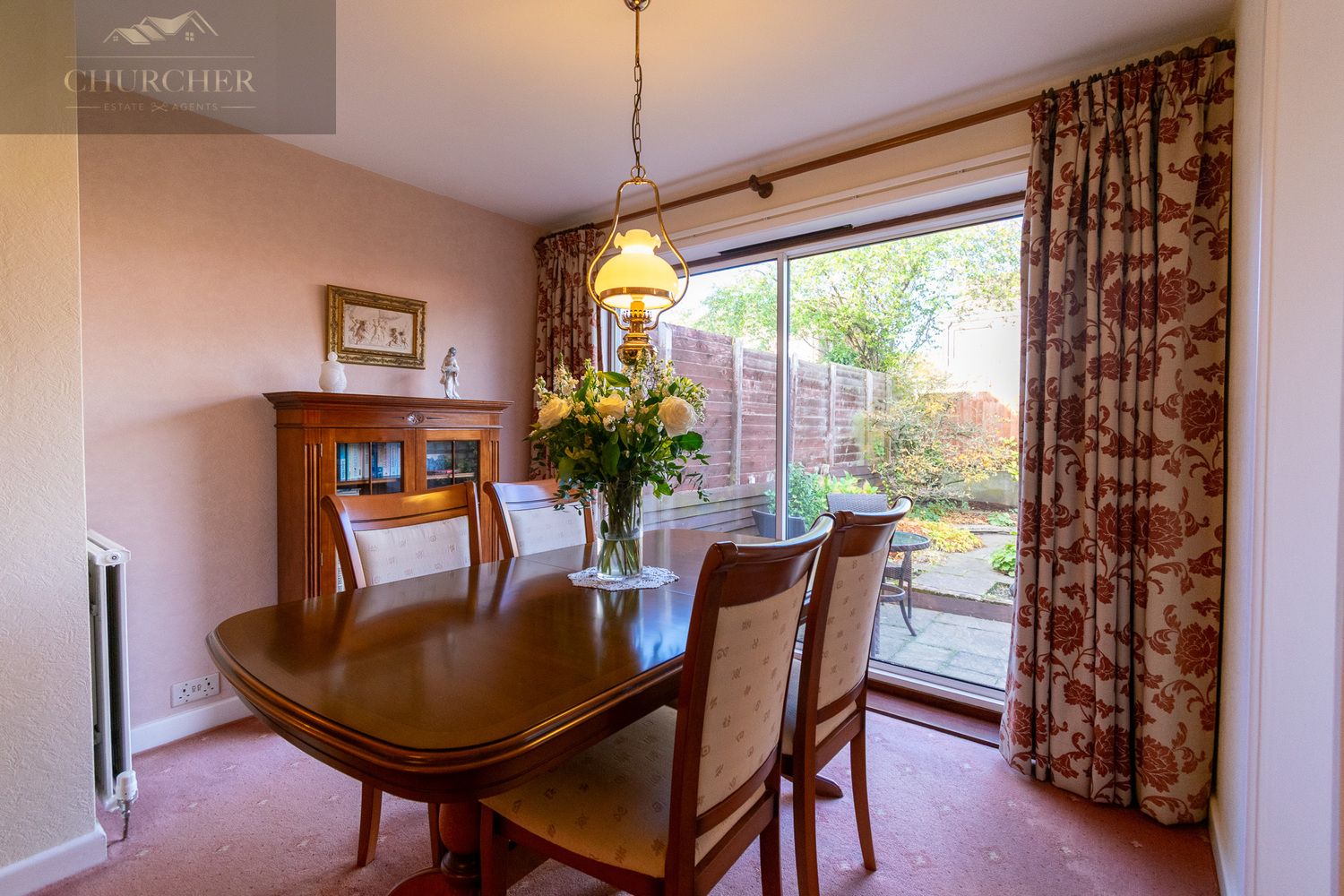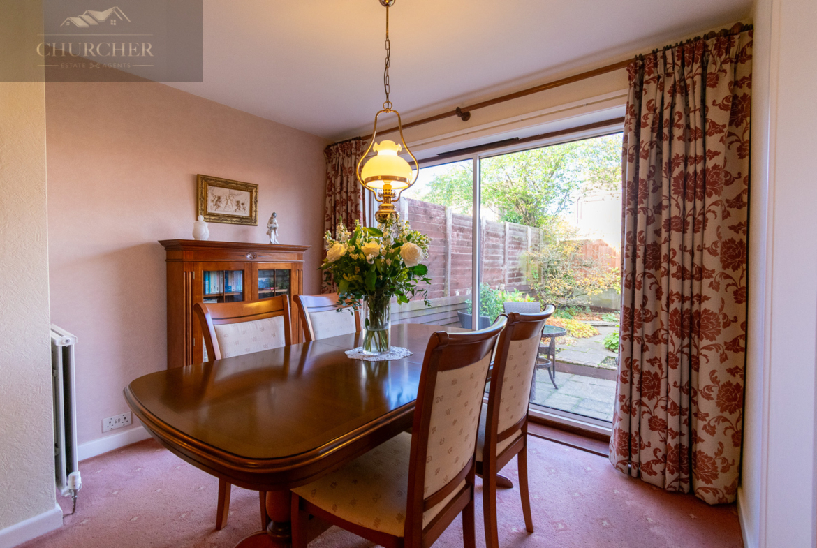 The dining area is a wonderful continuation of the living space, offering an ideal setting for family meals or entertaining guests. Large patio doors open directly onto the rear garden, allowing natural light to pour in and creating a bright and airy feel. The room’s layout makes it perfectly suited for both everyday living and hosting special occasions, with space for a family-sized dining table and furnishings that overlook the peaceful garden beyond.