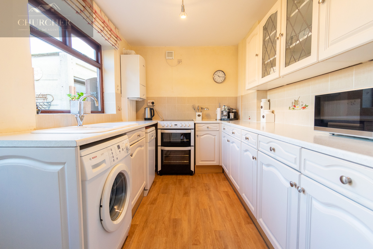 The kitchen, accessed conveniently from the dining area, is fitted with a comprehensive range of wall and base units, providing ample storage and preparation space. Its neutral palette enhances the bright and airy atmosphere, while practical features such as a fitted sink beneath the window, and areas for freestanding appliances make it both functional and homely. This is a kitchen designed for practicality, yet full of potential for a modern refresh should the new owners wish.