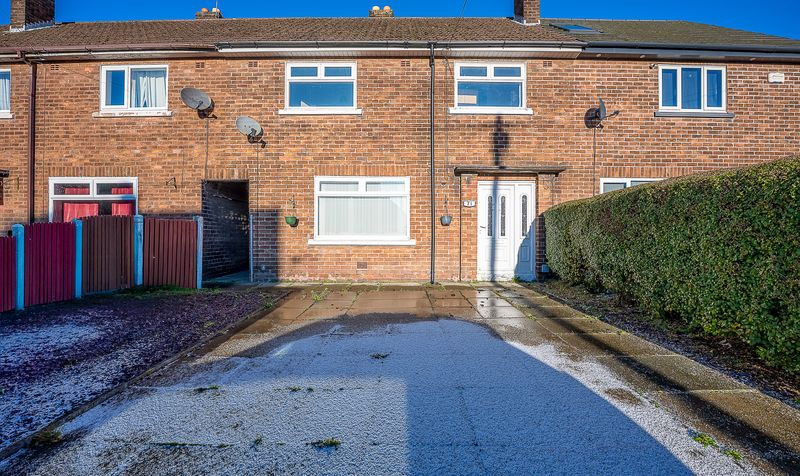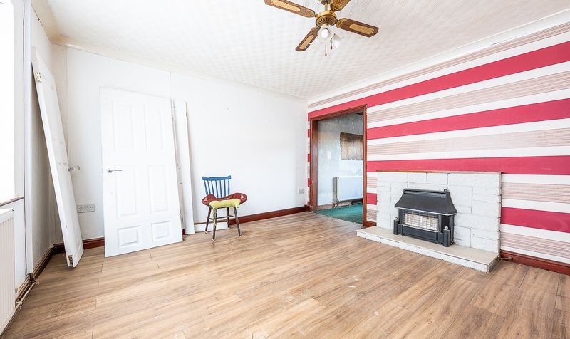 Approached via a paved frontage, the property opens into a welcoming entrance hallway with stairs rising to the first floor. To the front of the home sits a generous lounge, naturally lit by a large window and featuring a focal fireplace, offering a comfortable living space with clear scope for modernisation and personalisation.