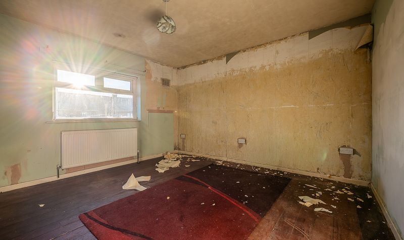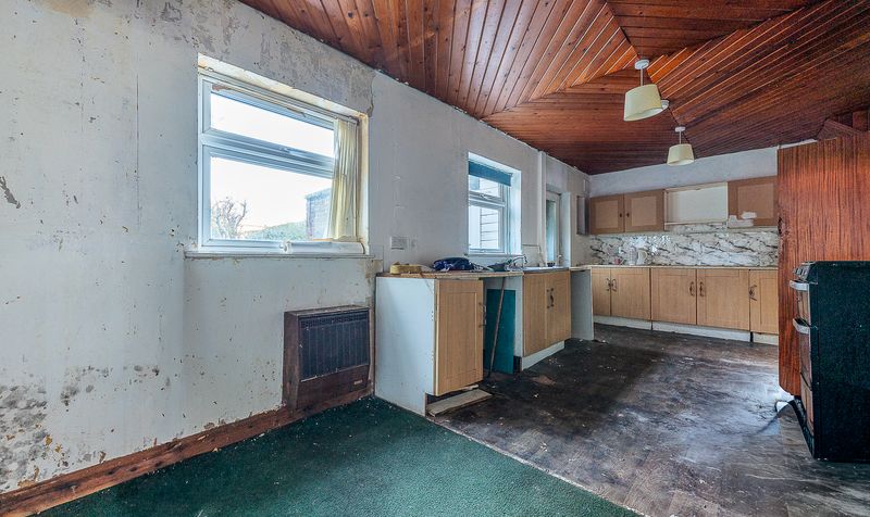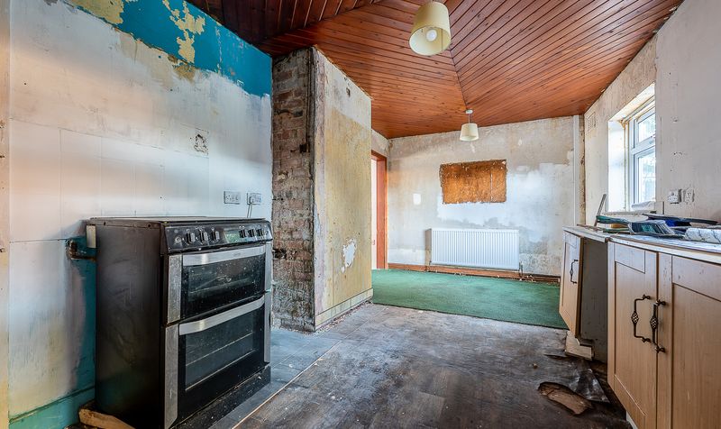 Moving through to the rear, the kitchen diner provides an excellent footprint for a future open and sociable family space. Currently fitted with a range of base units and space for freestanding appliances, the room benefits from ample natural light and flows easily into a further rear lobby area. From here, access is provided to a practical utility room and an additional workshop or storage space, ideal for those seeking extra functionality or potential conversion, subject to the necessary consents.