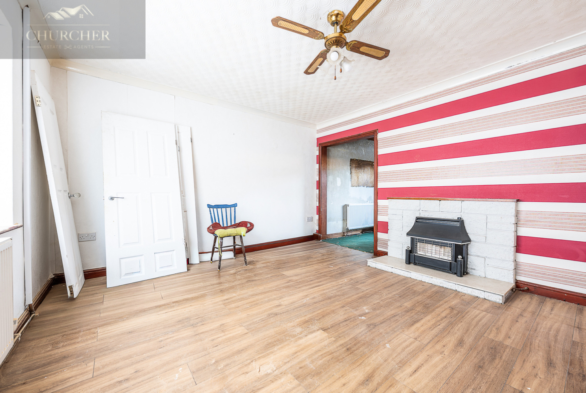 Approached via a paved frontage, the property opens into a welcoming entrance hallway with stairs rising to the first floor. To the front of the home sits a generous lounge, naturally lit by a large window and featuring a focal fireplace, offering a comfortable living space with clear scope for modernisation and personalisation.