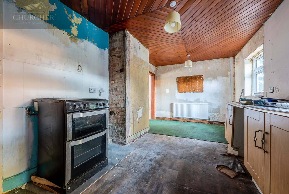 Moving through to the rear, the kitchen diner provides an excellent footprint for a future open and sociable family space. Currently fitted with a range of base units and space for freestanding appliances, the room benefits from ample natural light and flows easily into a further rear lobby area. From here, access is provided to a practical utility room and an additional workshop or storage space, ideal for those seeking extra functionality or potential conversion, subject to the necessary consents.