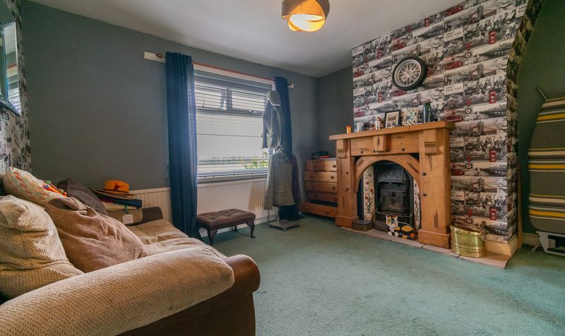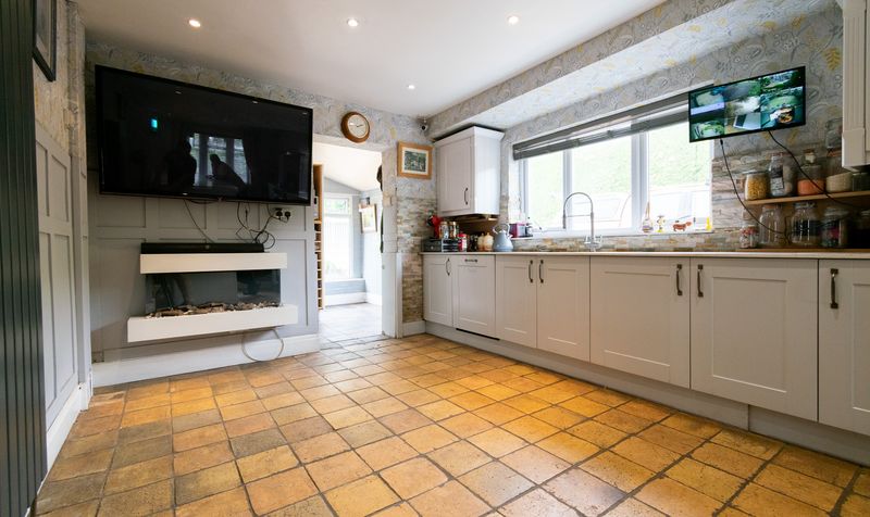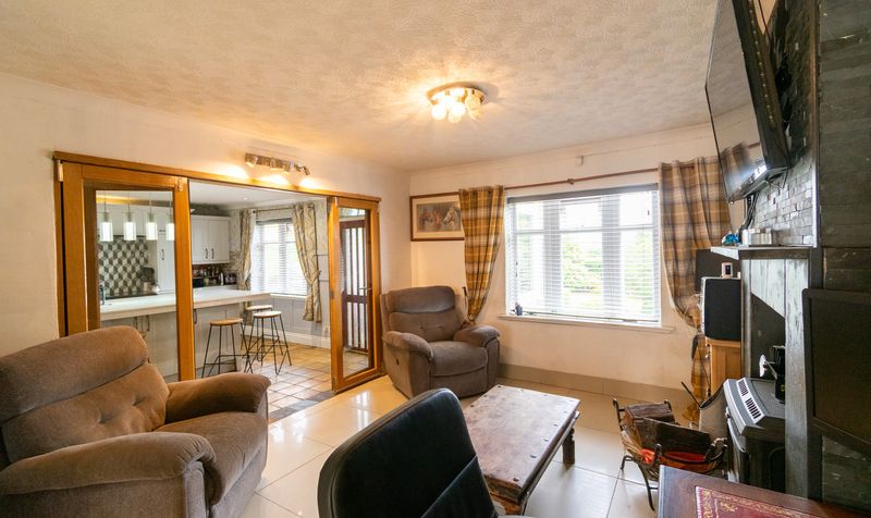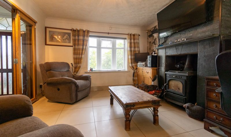 From here, double doors open into the living room, a warm and inviting space designed for comfort and relaxation. A large front-facing window fills the room with natural light, enhanced by soft, neutral tones and traditional plaid curtains. The focal point is a striking slate fireplace with a wood-burning stove, perfect for cosy evenings, and topped with a mounted television for modern convenience. The room is well-proportioned, with ample space for seating, currently arranged with plush reclining armchairs that add to the homely feel. Sleek tiled flooring gives a clean, contemporary edge, while the wooden sliding doors open directly into the kitchen, creating a seamless flow between the two spaces and allowing this room to function equally well for everyday family living or as a comfortable retreat at the end of the day.