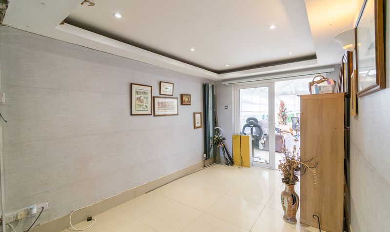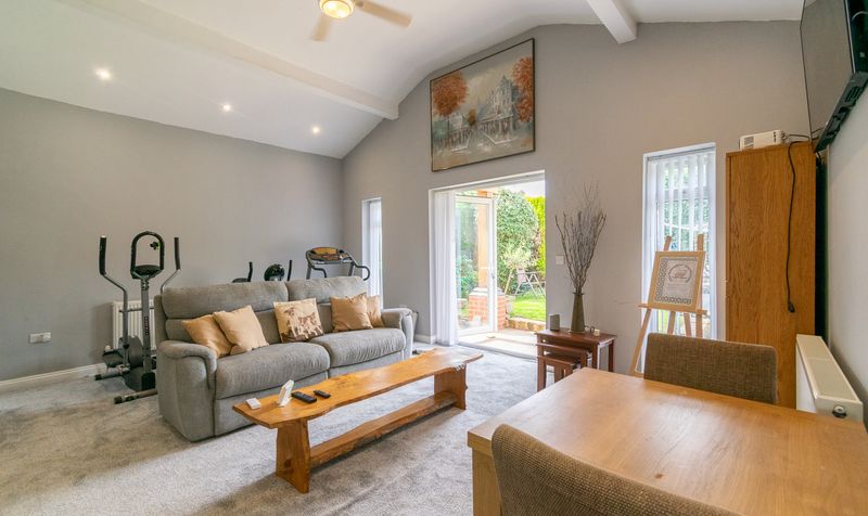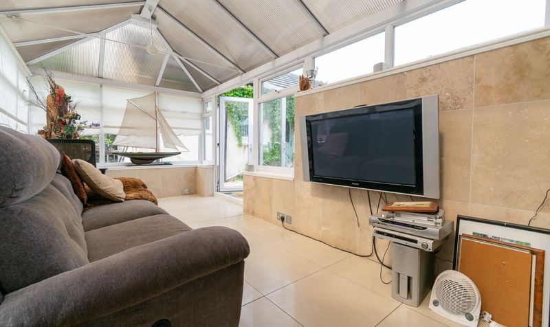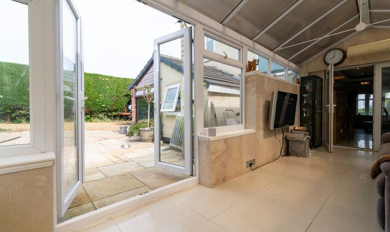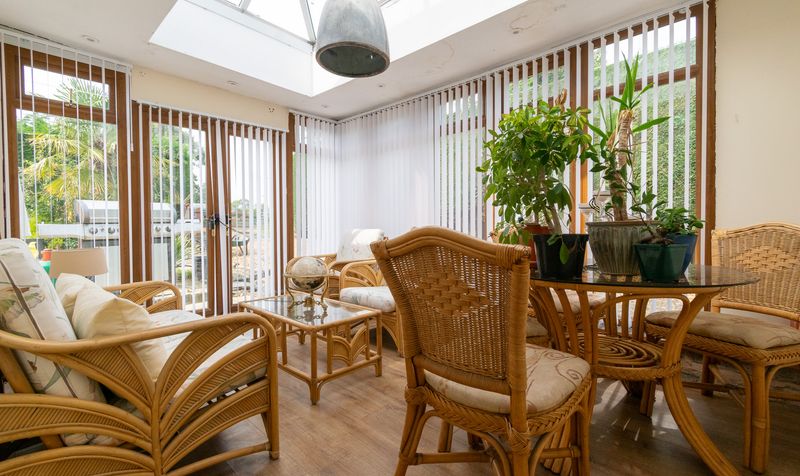 To the rear of the property, the conservatory is a wonderfully light-filled retreat, with wrap-around windows and glazed doors leading to the garden. Finished with tiled flooring and ample space for seating, this room is perfect for enjoying the changing seasons while remaining comfortable indoors.