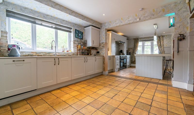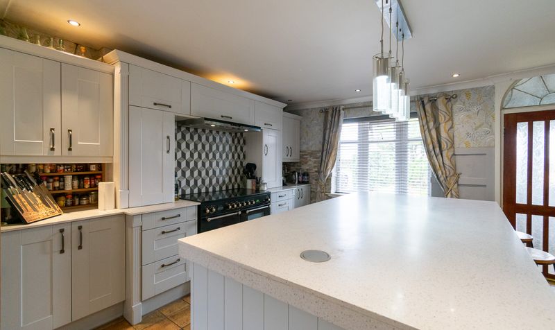 Stepping into the property through the porch, you are welcomed straight into the heart of the home: a showstopping dining kitchen. Centred around a broad, quartz-effect island with breakfast seating for four, this beautifully finished space combines style with everyday practicality. Classic shaker cabinetry in a soft, contemporary tone is paired with long bar handles and deep pan drawers, all set against textured feature walling and a warm, easy-care quarry tiled floor. A statement cooking zone frames a range-style cooker with twin ovens, canopy hood, and the striking geometric splashback seen in the photos, while long stretches of worktop provide generous prep space. A wide sink is set beneath a broad window drawing in natural light and a pleasant garden aspect, and the whole room is illuminated by recessed downlights with a sleek quartet of pendant lights accenting the island.