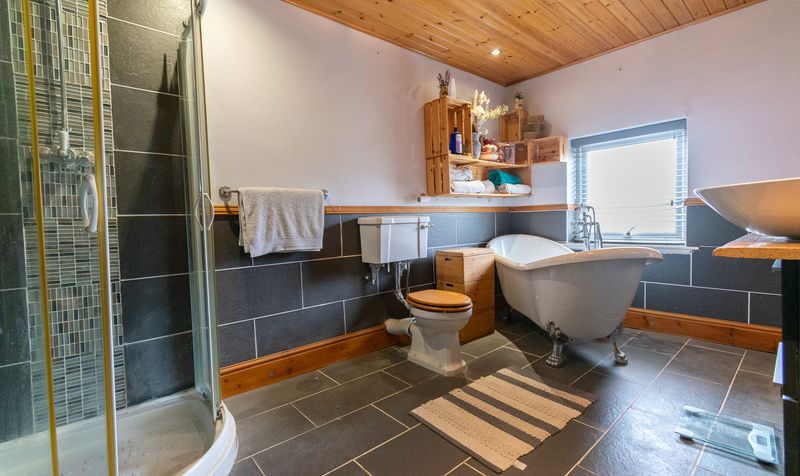 Serving these rooms is the stylish family bathroom, which combines rustic charm with modern convenience. A clawfoot freestanding bathtub with traditional fittings takes centre stage, accompanied by a separate corner shower enclosure for flexibility. Twin vessel sinks mounted on a sleek vanity provide ample space for busy mornings, while the natural wood-panelled ceiling and slate-effect tiled floor create a warm, spa-like feel. Thoughtful shelving and storage solutions enhance both practicality and aesthetics, making this a truly welcoming and functional family space.