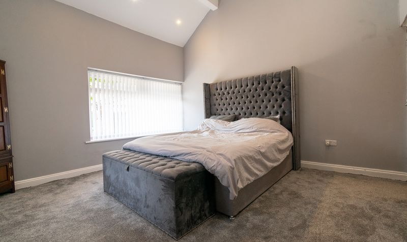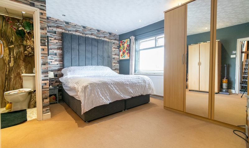 The first floor is home to three generously proportioned bedrooms, each beautifully presented and full of character. The principal bedroom is a spacious and stylish retreat, thoughtfully designed to blend comfort with contemporary touches. A striking feature wall with a modern textured brick-effect finish frames the large, upholstered headboard, creating a focal point behind the bed. Neutral carpeting underfoot adds warmth, while a wide window fills the room with natural light and offers a pleasant outlook.
