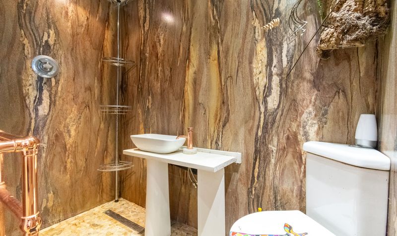 Adjoining the bedroom is a unique and beautifully appointed en-suite shower room. The space is wrapped in dramatic natural stone-effect wall panels, giving it a spa-inspired atmosphere, complemented by a pebble-style floor in the shower area. The open, walk-in shower features contemporary fittings, while a sleek pedestal vanity with a vessel sink and rose gold tap adds a modern flourish. A matching WC completes the suite, with thoughtful decorative touches adding personality and character to this luxurious private bathroom.