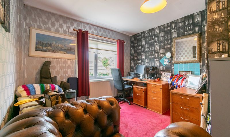 The second bedroom is currently arranged as a home office and guest room, offering a versatile space that could easily adapt to a variety of needs. Bold, contemporary wallpaper is paired with vibrant red carpeting, creating a lively and inspiring environment. The room benefits from a large window overlooking the rear, ensuring a bright working or relaxing atmosphere.