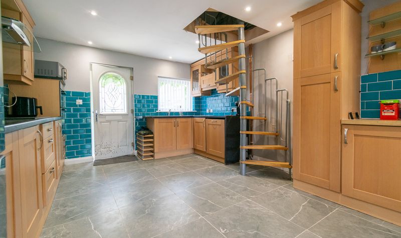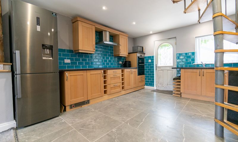 The detached annex is a superb addition, offering fully self-contained accommodation. A bright and airy lounge with vaulted ceilings and French doors opens directly onto the garden, creating a seamless indoor-outdoor flow. The fitted kitchen pairs warm wood cabinetry with striking teal subway tiles, and a spiral staircase leads to additional space above. A generous double bedroom and a modern shower room complete the interior, while a charming garden room with full-height windows and a glass roof lantern floods the space with natural light and frames tranquil views over the landscaped grounds.