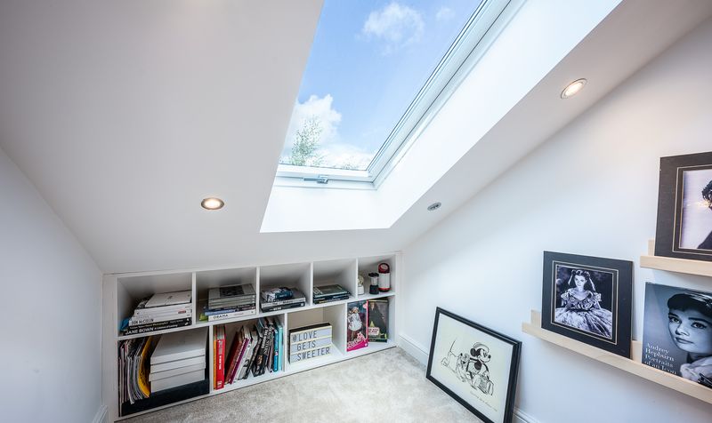 A bespoke timber staircase leads up to a mezzanine level, complete with a skylight that floods the area with daylight, making it an inviting and adaptable retreat. This upper level is currently styled as a reading or relaxation zone, but it could easily be tailored to suit a variety of needs, from a play den to additional storage. Finished in soft neutral tones with spotlights and modern fittings, the room feels bright, fresh, and highly flexible – equally well suited as a teenager’s bedroom, guest suite, or creative workspace.