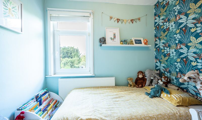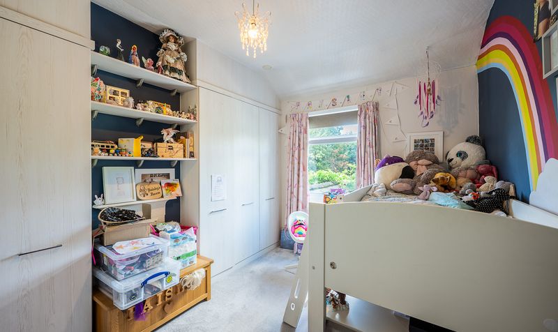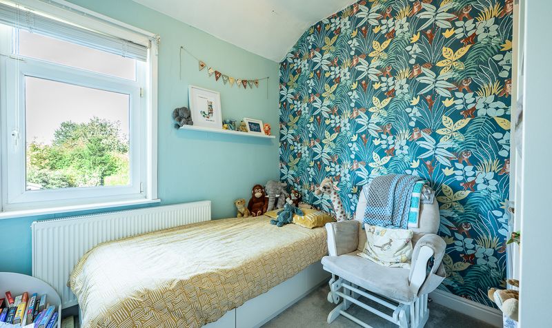 The first floor continues to impress with four well-proportioned bedrooms. The principal bedroom to the front offers a sophisticated finish with fitted wardrobes and a calming palette. A second double bedroom is perfect for children, complete with built-in storage and a playful rainbow feature wall, while the third bedroom is styled with bold wallpaper and is ideal as a nursery, child’s room, or study.