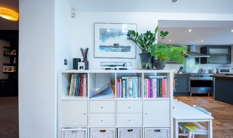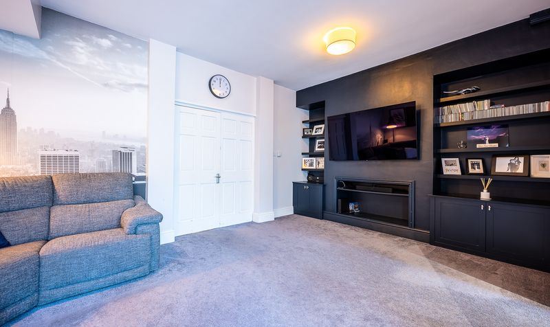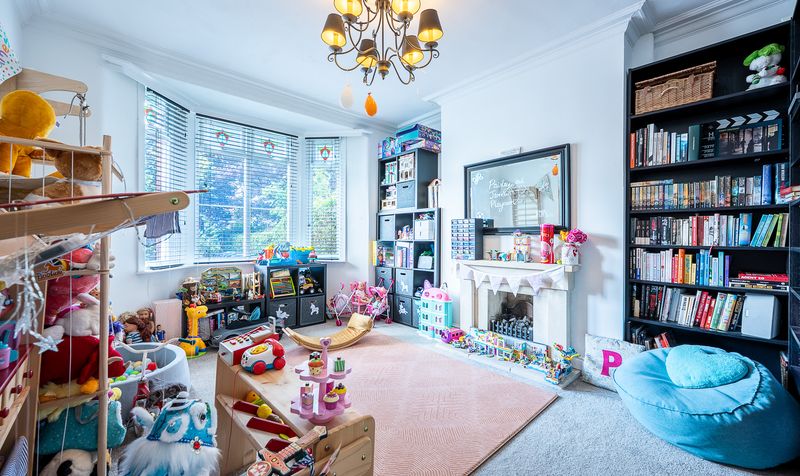 Stepping through the front door, the hallway leads into a generous front reception room with a striking bay window, high ceilings, and a feature fireplace. Currently styled as a playroom and library, this flexible space makes an ideal sitting room or home office. Beyond, a second lounge offers a cosy yet stylish retreat, finished with bespoke shelving, a media wall, and soft décor, creating the perfect spot for relaxing evenings. This room could also be used as a formal dining room.