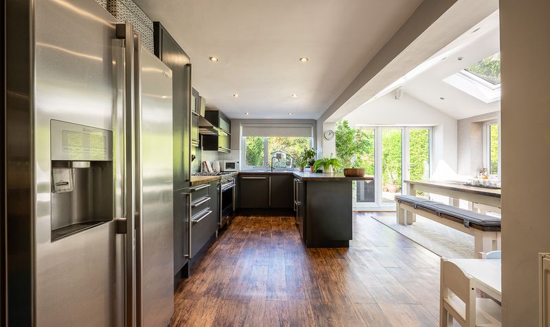 At the heart of the home lies the stunning open-plan kitchen, dining, and family space. The kitchen is beautifully appointed with sleek cabinetry, wood-effect worktops, and a range-style cooker, complemented by a central island. Flowing seamlessly into the dining and living area, this bright and airy space boasts a vaulted ceiling with multiple skylights and French doors that open directly onto the garden. It is a truly impressive area, designed for entertaining, family gatherings, and everyday living. The ground floor also benefits from a practical utility space and a contemporary shower room finished to a high standard.