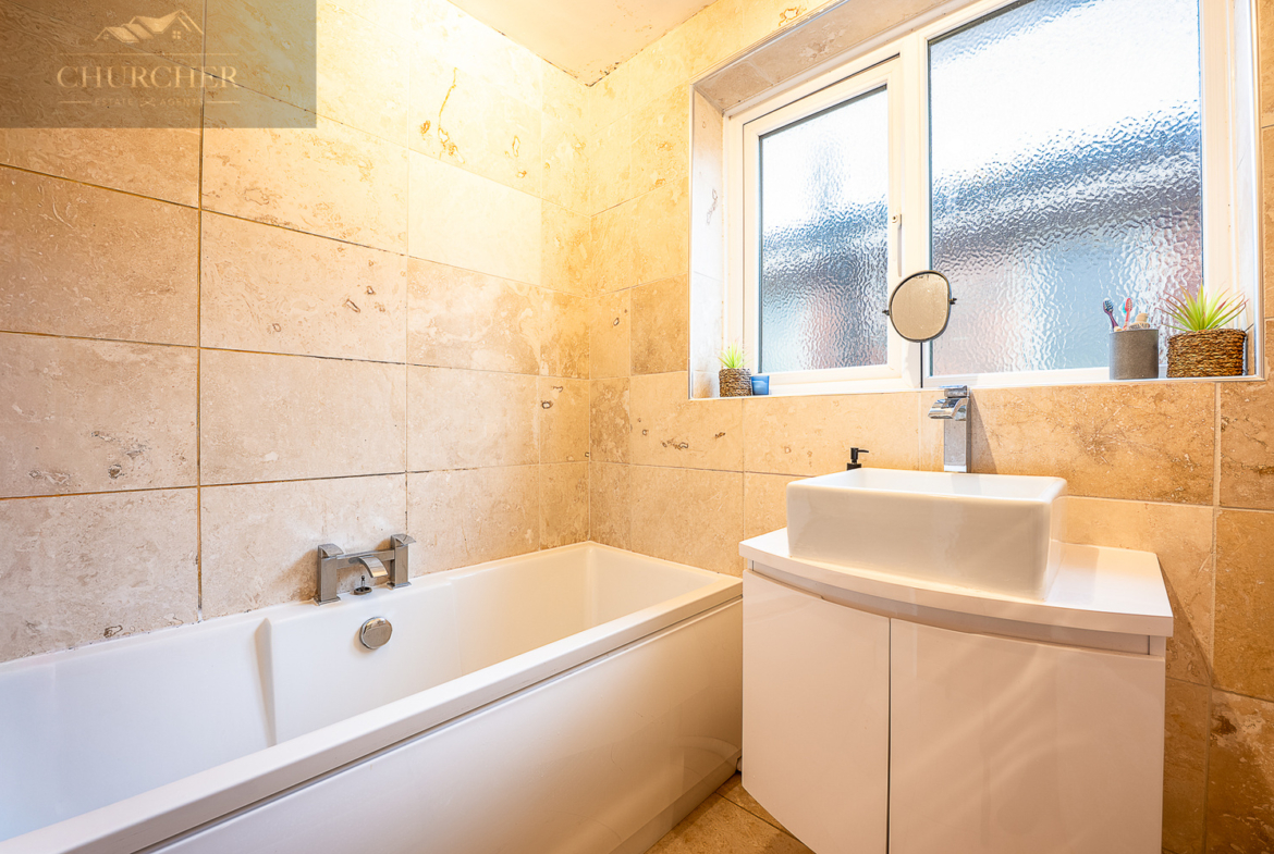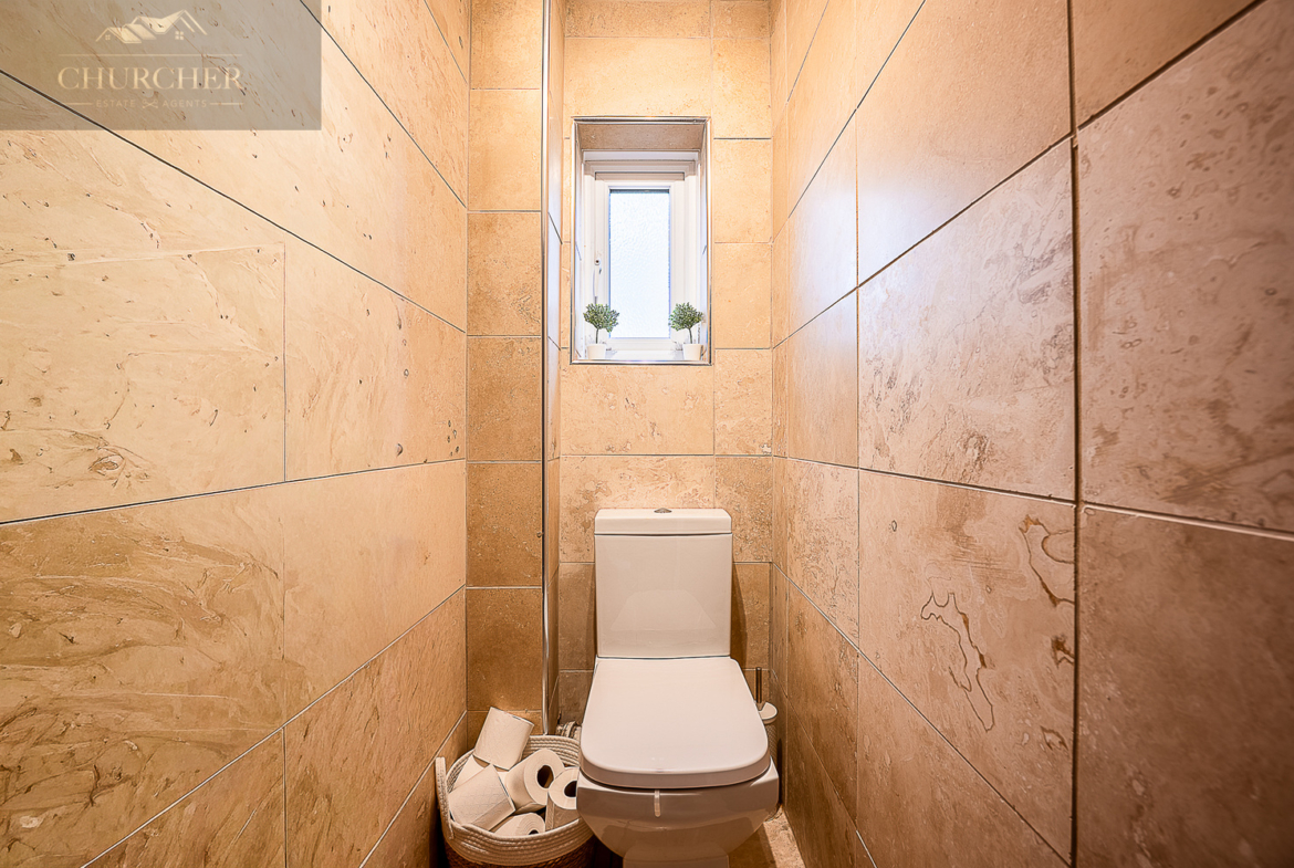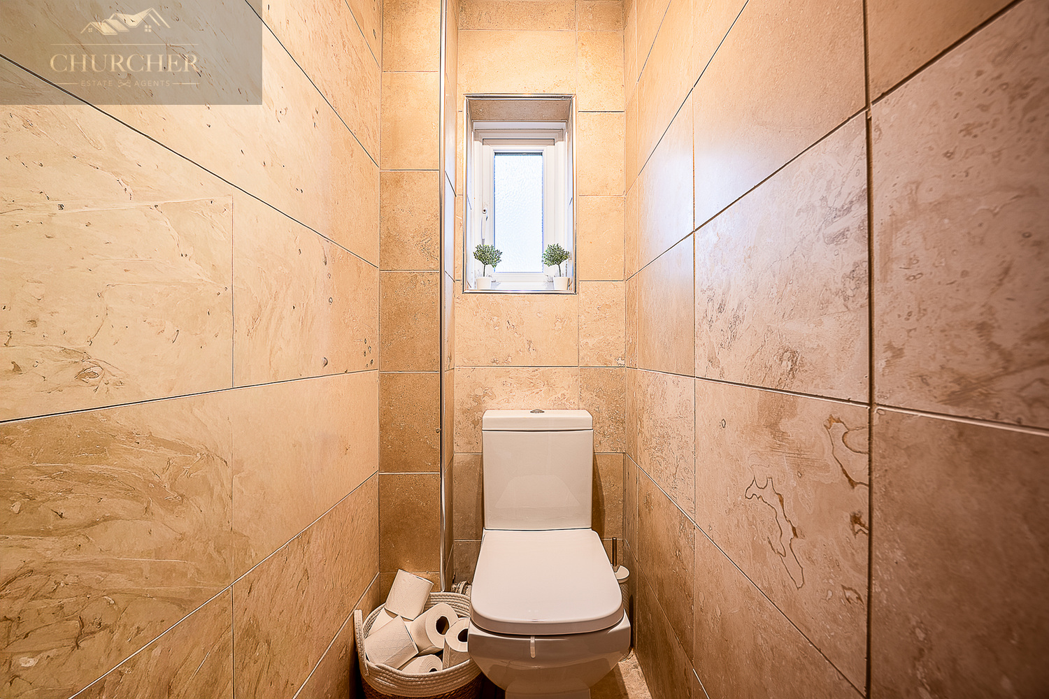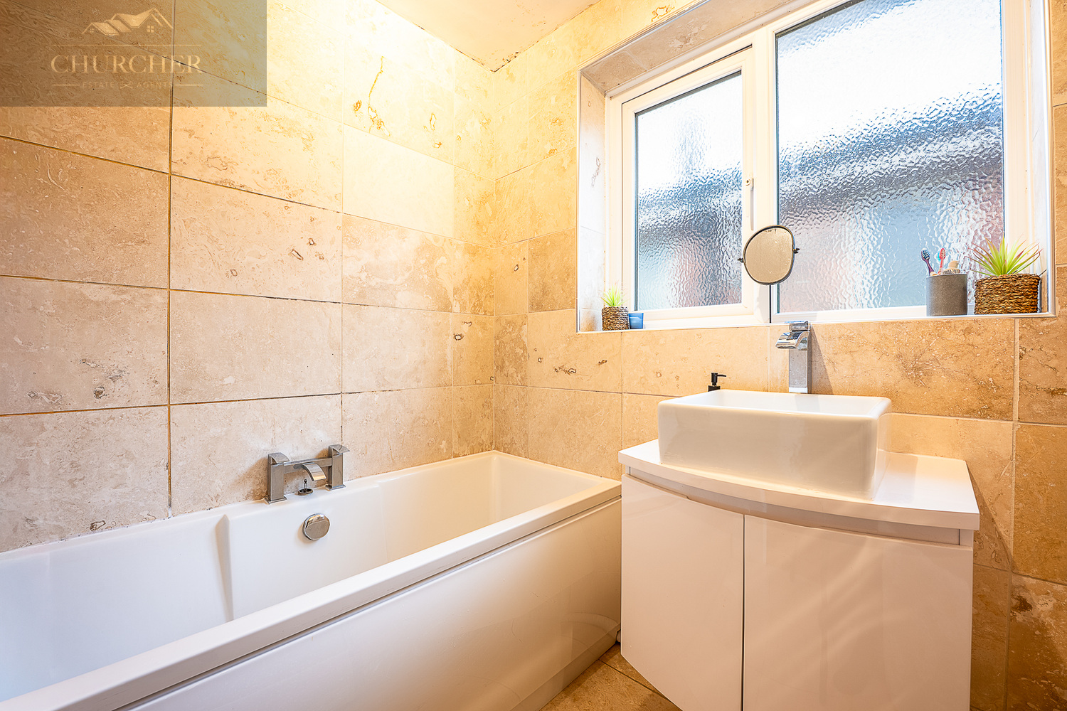 The modern family bathroom is finished with contemporary stone-effect tiling and features a full-sized bath with overhead shower and a sleek vanity unit. A separate upstairs WC provides additional convenience for busy households.