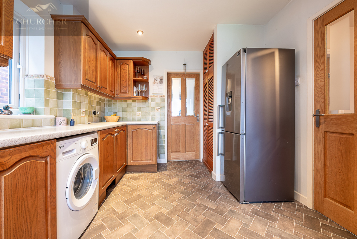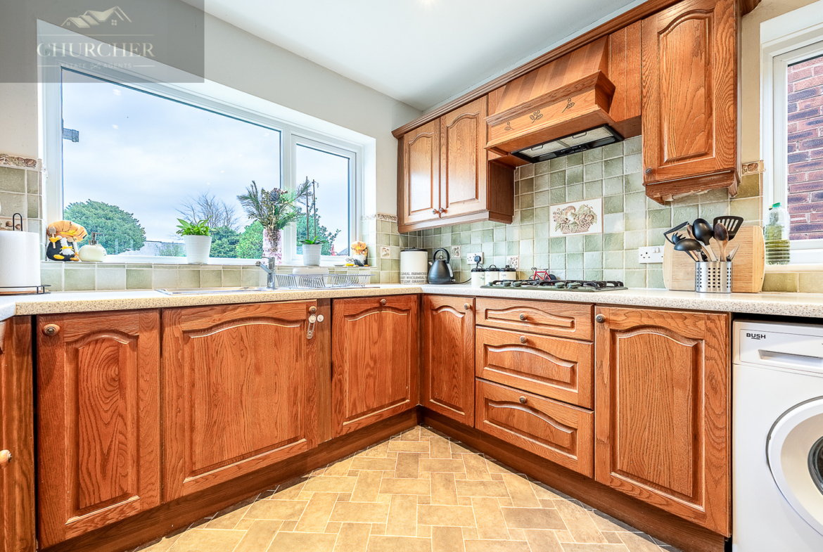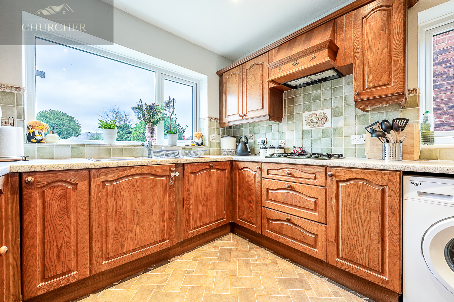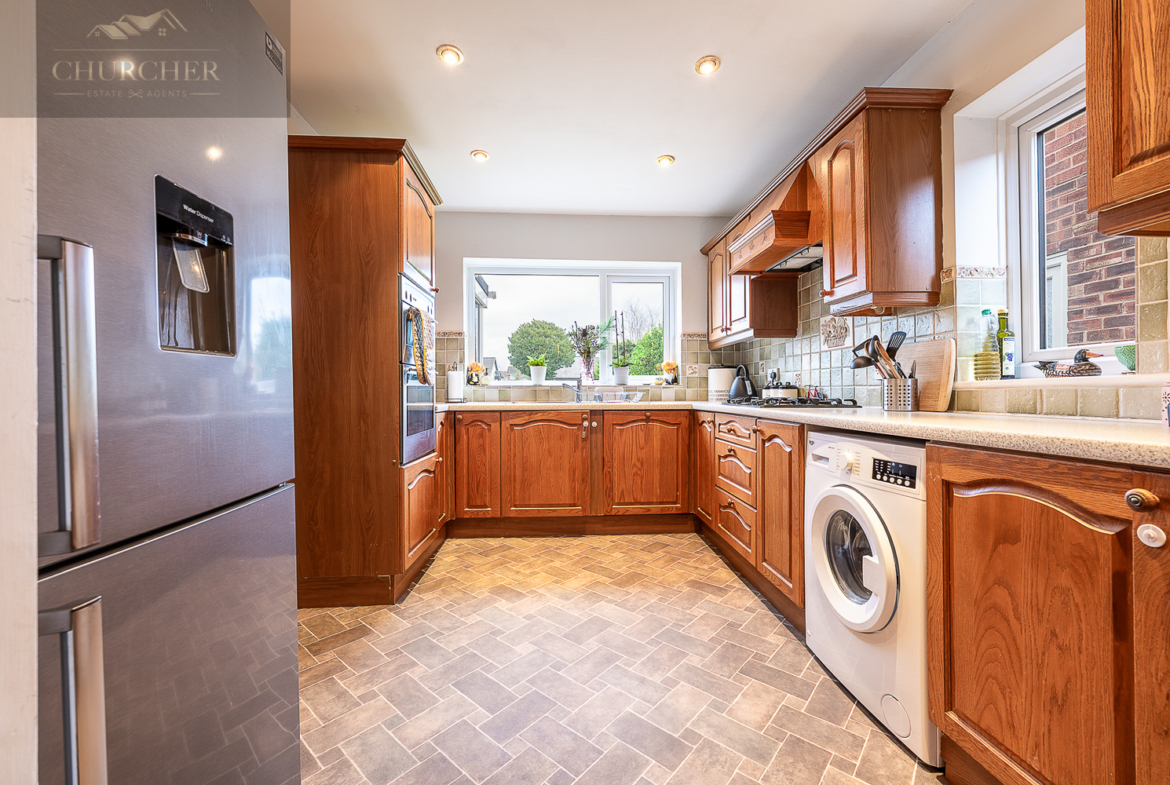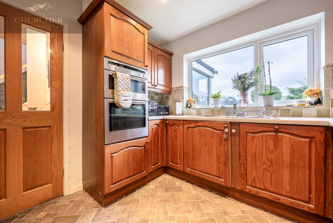 To the front of the home, the kitchen enjoys an abundance of natural light from its wide picture window. This generous room is fitted with an extensive range of traditional cabinetry, ample work surfaces, a double oven, gas hob, and space for freestanding appliances. The layout allows for effortless meal preparation while offering lovely views across the front garden.