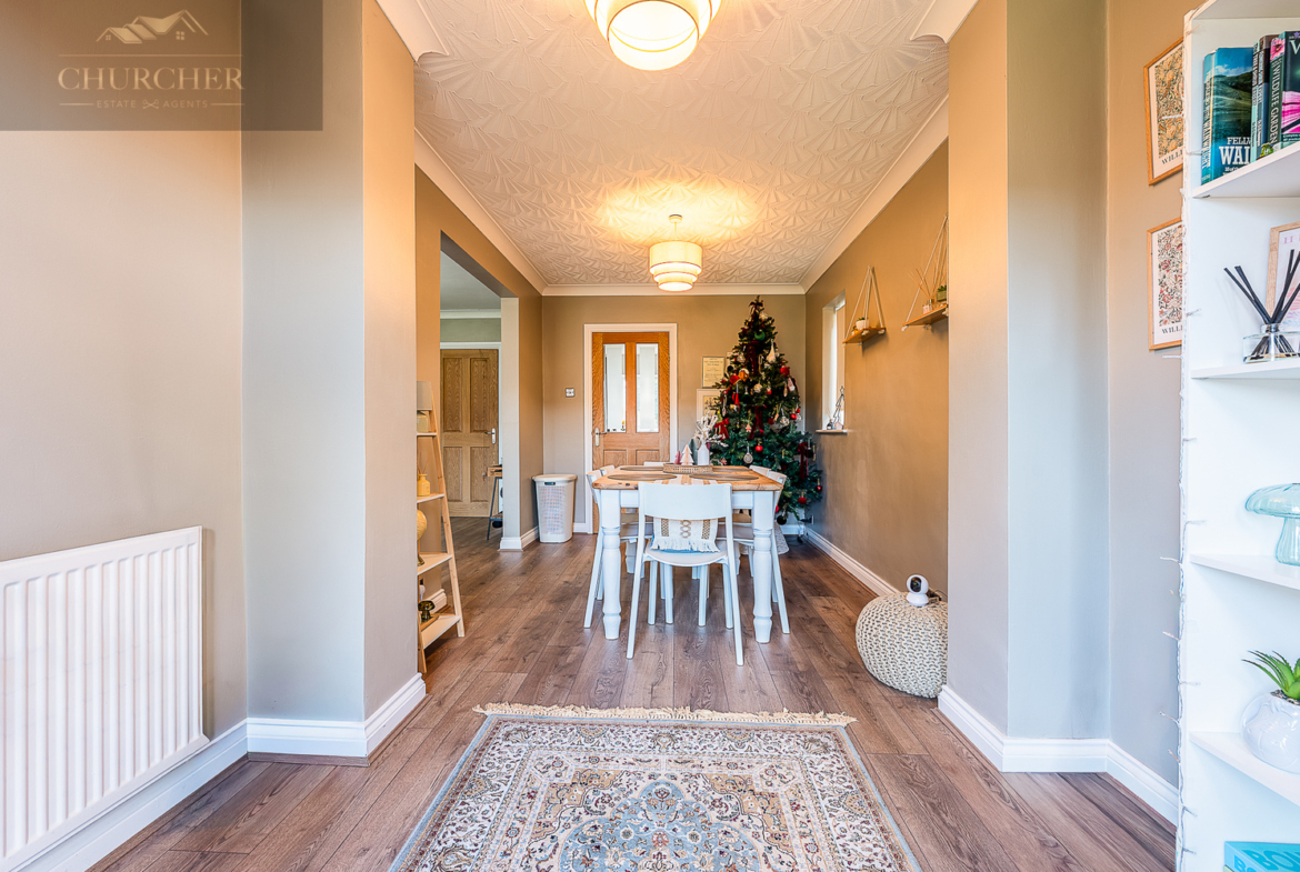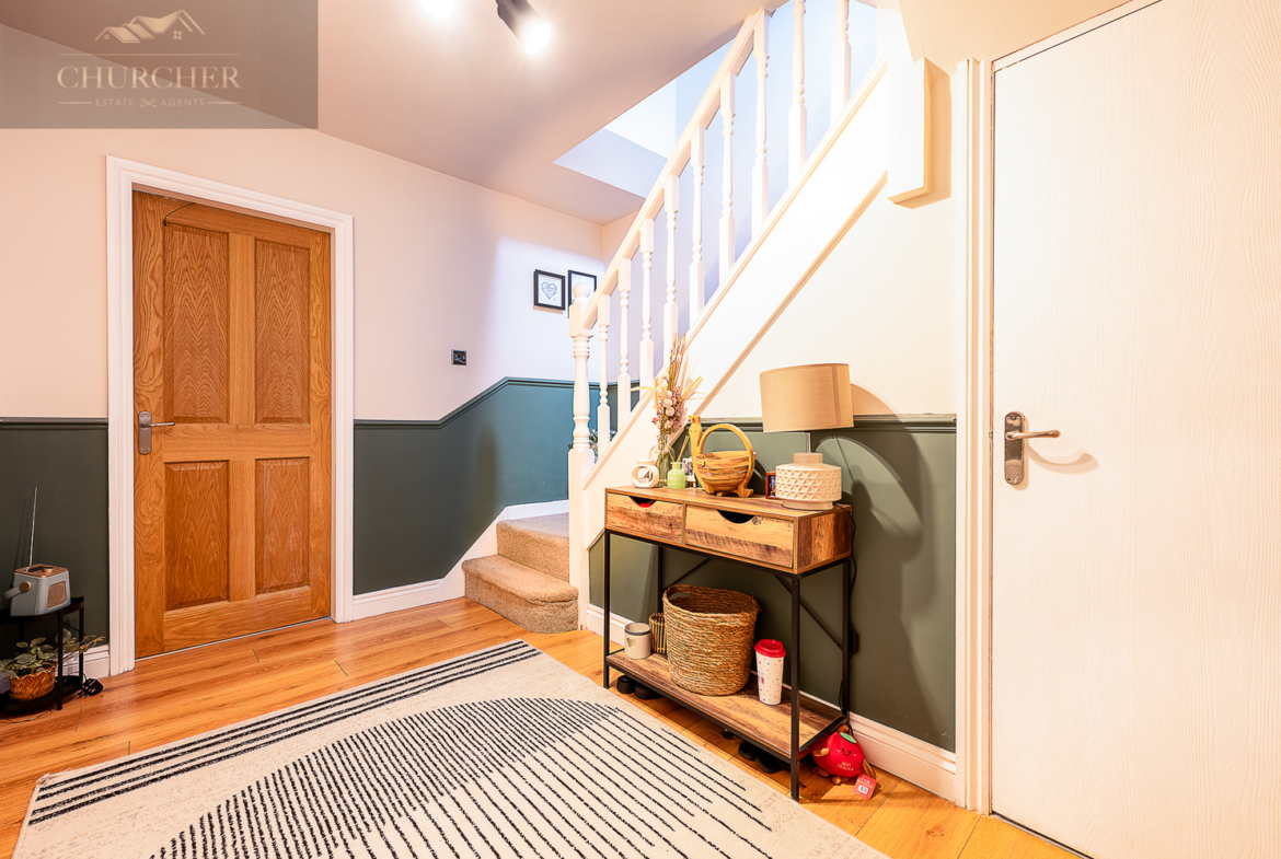 A convenient porch provides a sheltered and practical entrance before stepping into the beautifully presented hallway, where warm wooden flooring and tasteful décor create an immediate sense of welcome. The staircase rises to the first floor, complemented by soft neutral tones and a feature half-wall panel, while an understairs cupboard provides excellent everyday storage. Just off the hallway sits the downstairs WC, featuring a modern suite and a window that brings in natural light.