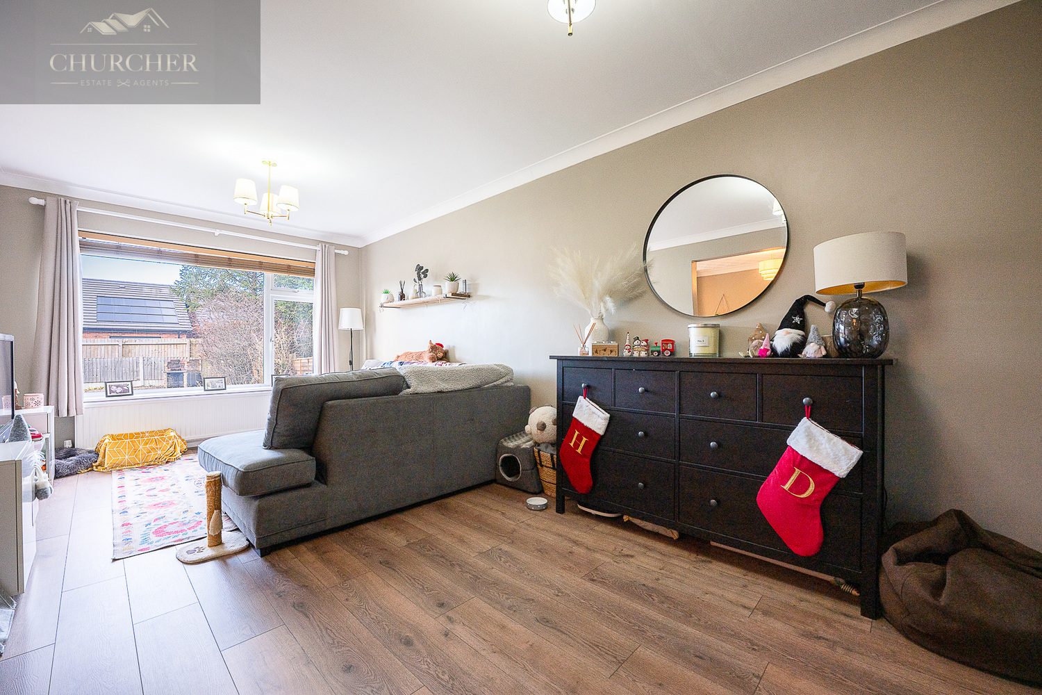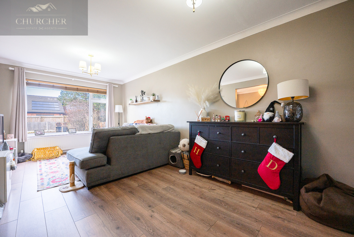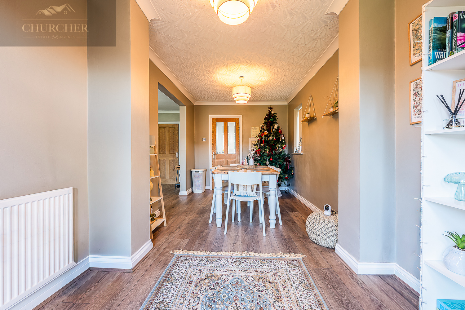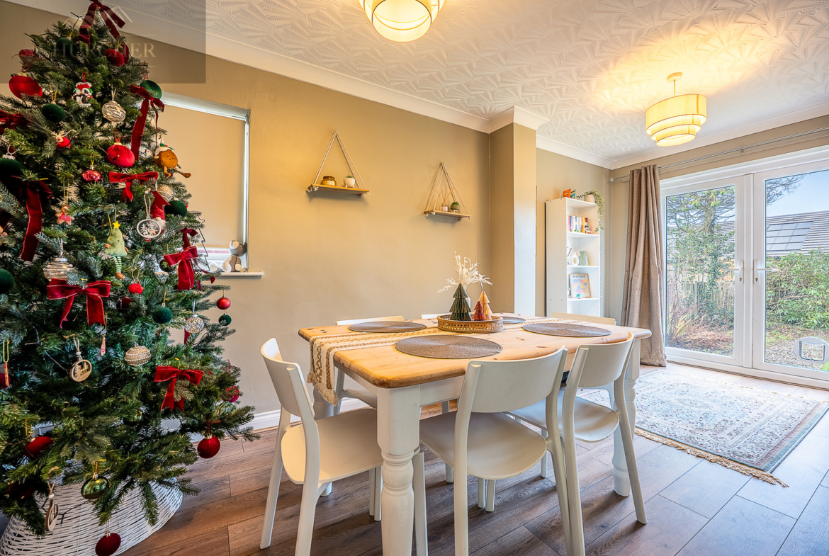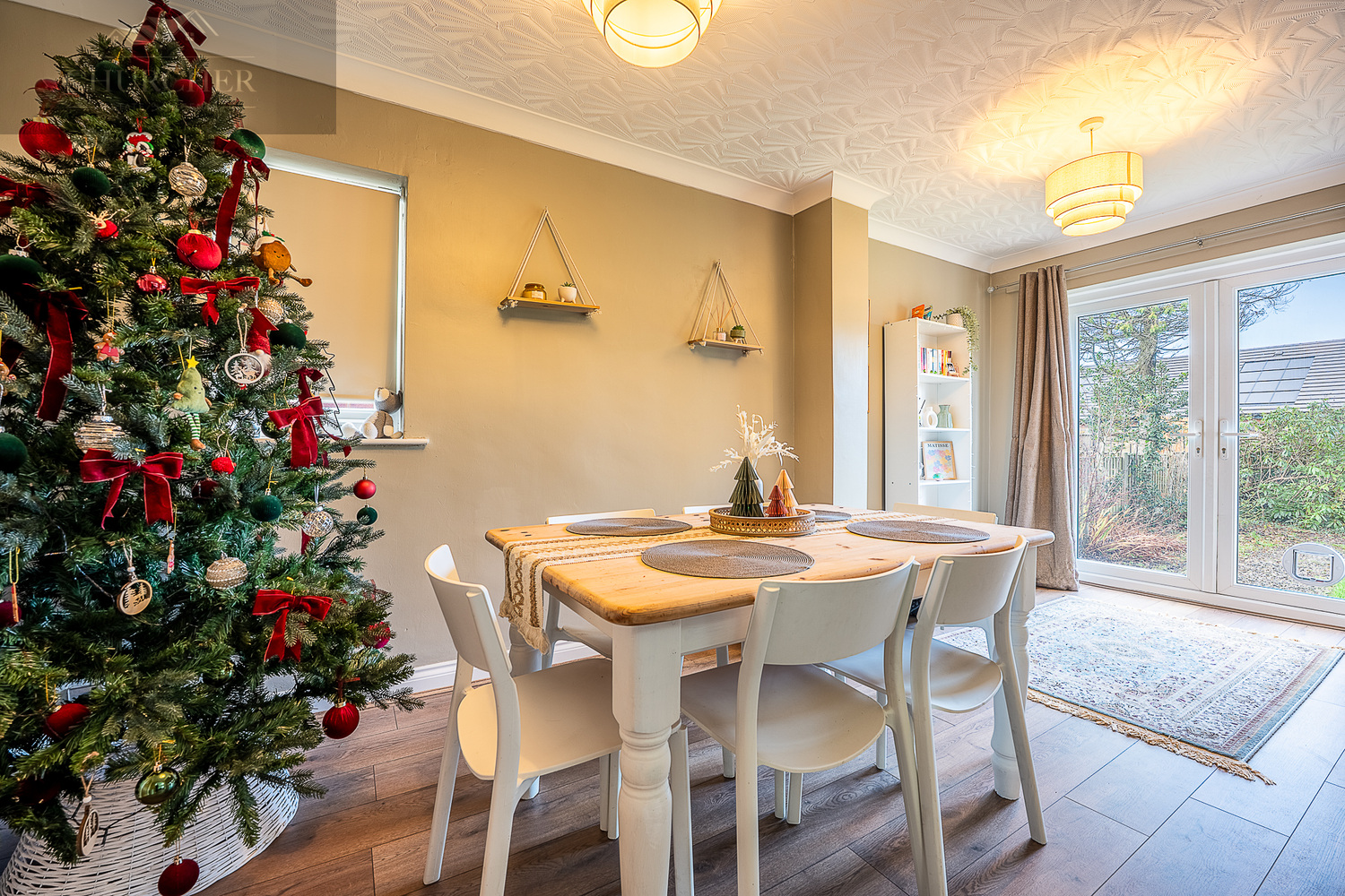 Flowing from the hallway toward the rear of the property, the accommodation opens into a wonderfully spacious lounge. This beautifully styled room benefits from a large rear-facing picture window, drawing in natural light and offering uninterrupted views of the garden. The space feels warm and inviting, with room for both a comfortable seating area and additional furnishings, making it the perfect spot for family time or quiet relaxation. An open archway leads through to the dining room, where the generous proportions continue. This room is bathed in light from both a side window and large patio doors, which open directly onto the garden. Together, the lounge and dining room create a superb open-plan feel while still retaining clear definition between living and dining spaces-an ideal setup for entertaining.