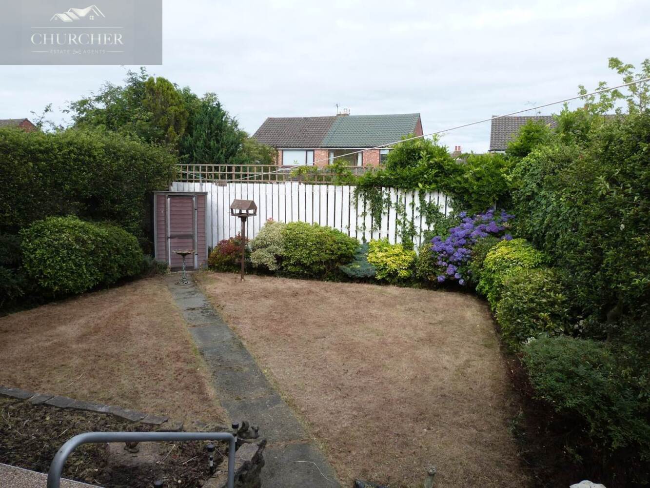 The rear garden is a well-maintained and private outdoor space, offering a mix of lawn, greenery, and functional elements. A central paved pathway leads from the house to the back of the garden, where a small wooden shed provides convenient storage. The garden is enclosed by a white painted fence with trellis detailing, which is adorned with climbing plants, adding a touch of charm and privacy.