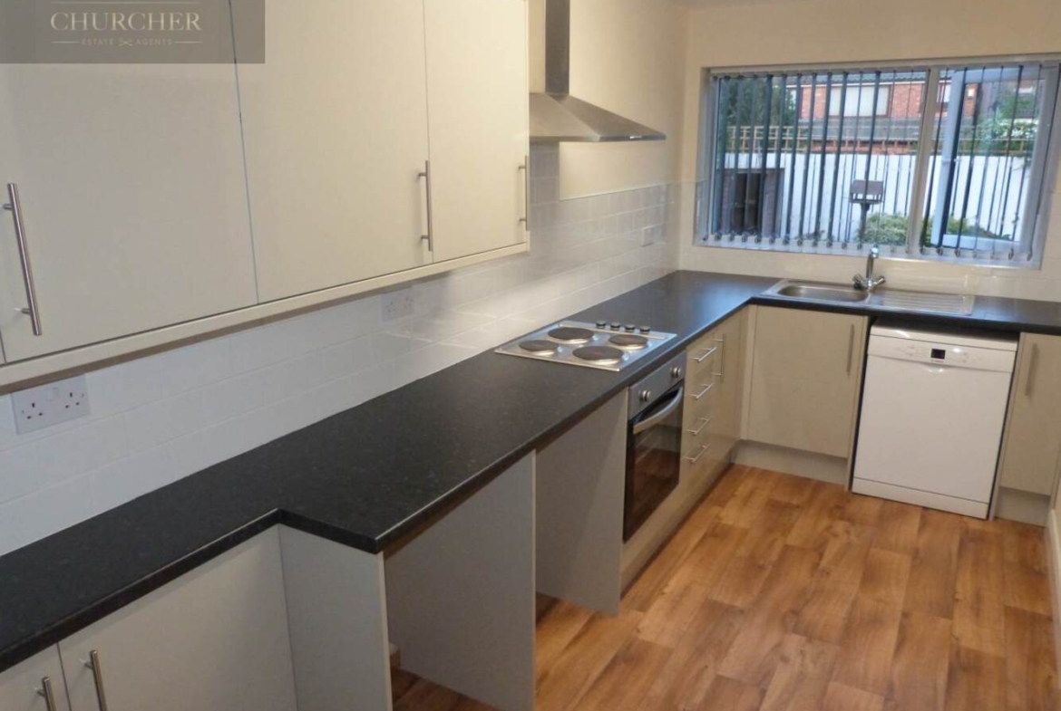 The current kitchen features a modern and functional design with a sleek L-shaped layout. The cabinetry is finished in a neutral colour with minimalist stainless-steel handles, offering ample storage space. The dark, speckled worktops provide a stylish contrast against the light cabinetry and are complemented by a white subway tile backsplash. The kitchen is equipped with an integrated hob and oven, accompanied by a contemporary stainless-steel extractor hood. A dishwasher is conveniently placed next to the sink area, which is positioned beneath a large window, allowing plenty of natural light to flow in. The window is fitted with vertical blinds for added privacy.
