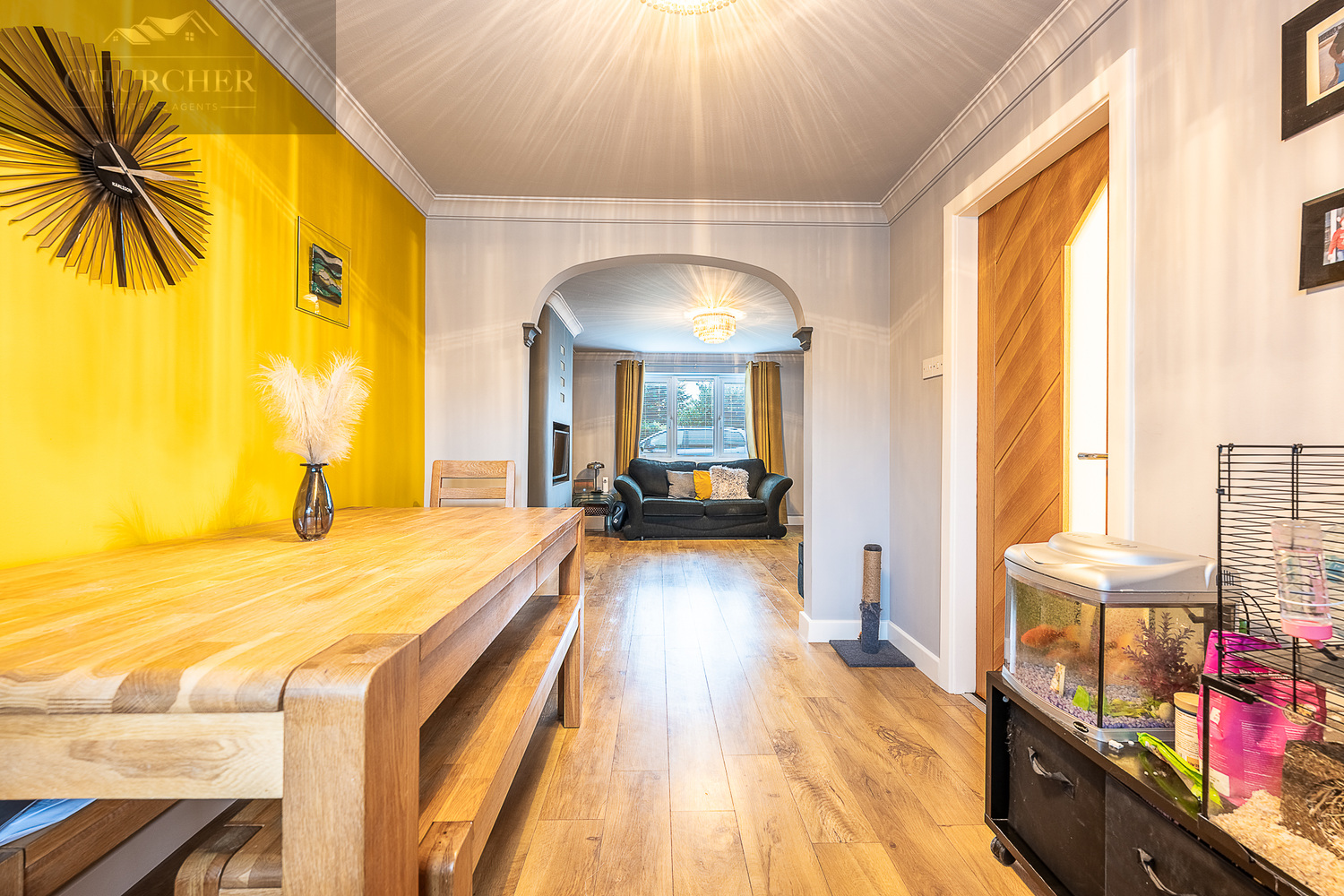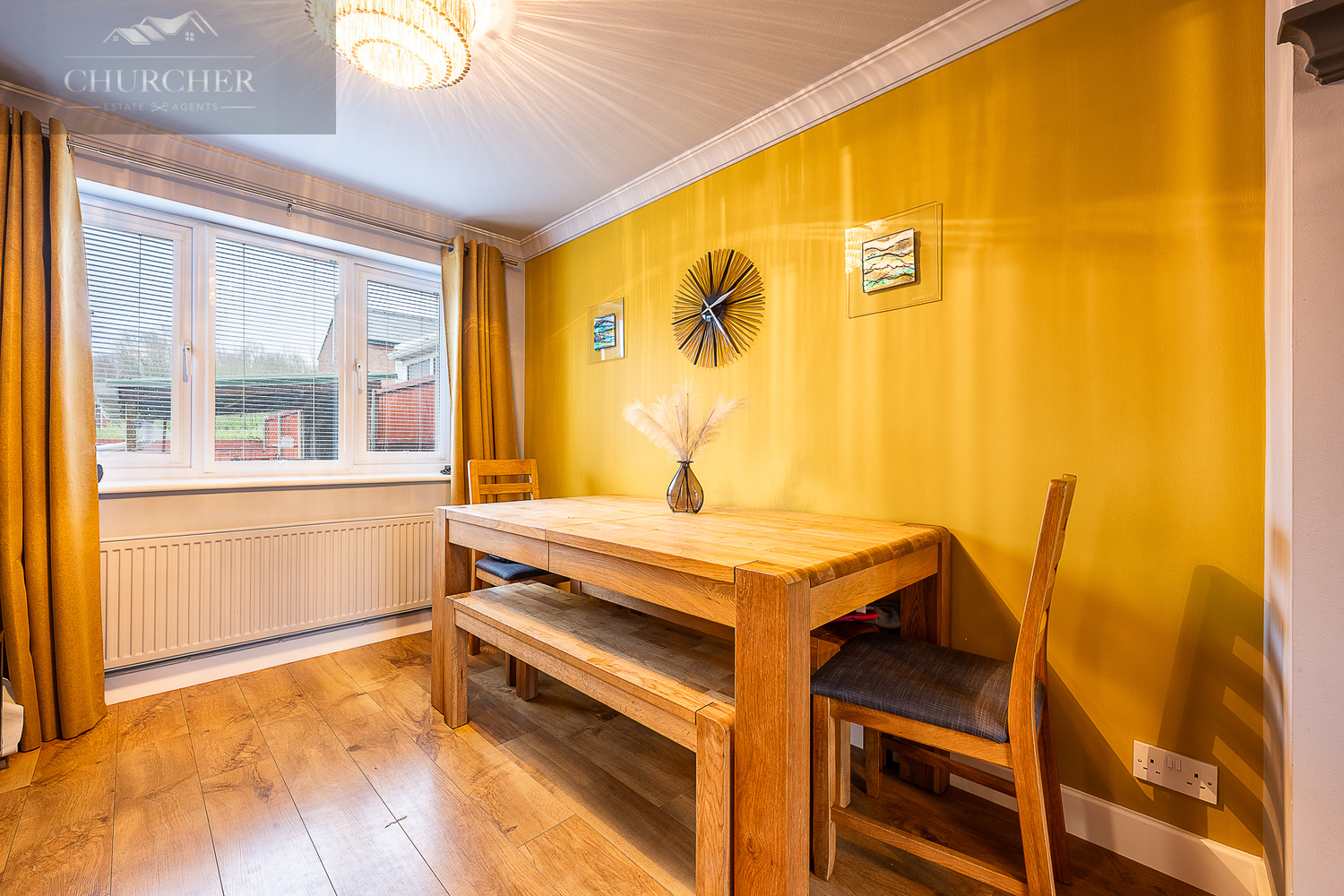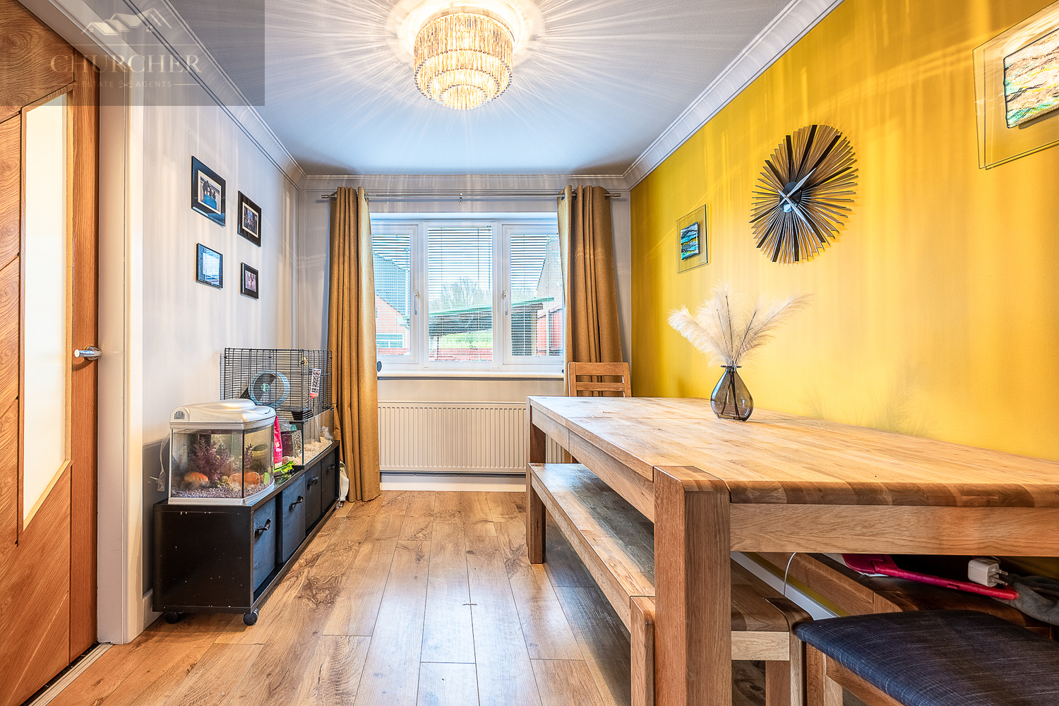 To the rear of the property, the dining room provides a wonderful setting for family meals and social occasions. This well-proportioned room enjoys views over the rear garden and is enhanced by bold feature walls and wood-effect flooring, creating warmth and character. Its open connection to the rest of the ground floor allows for a natural flow through the home while still feeling like a distinct and defined space.
