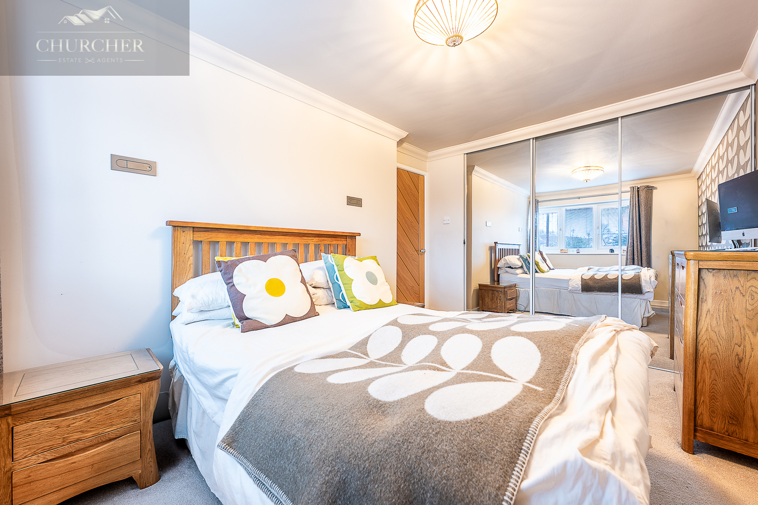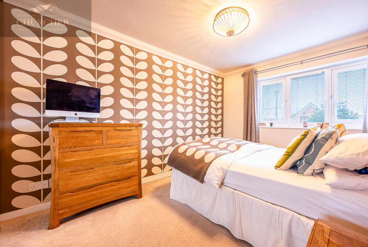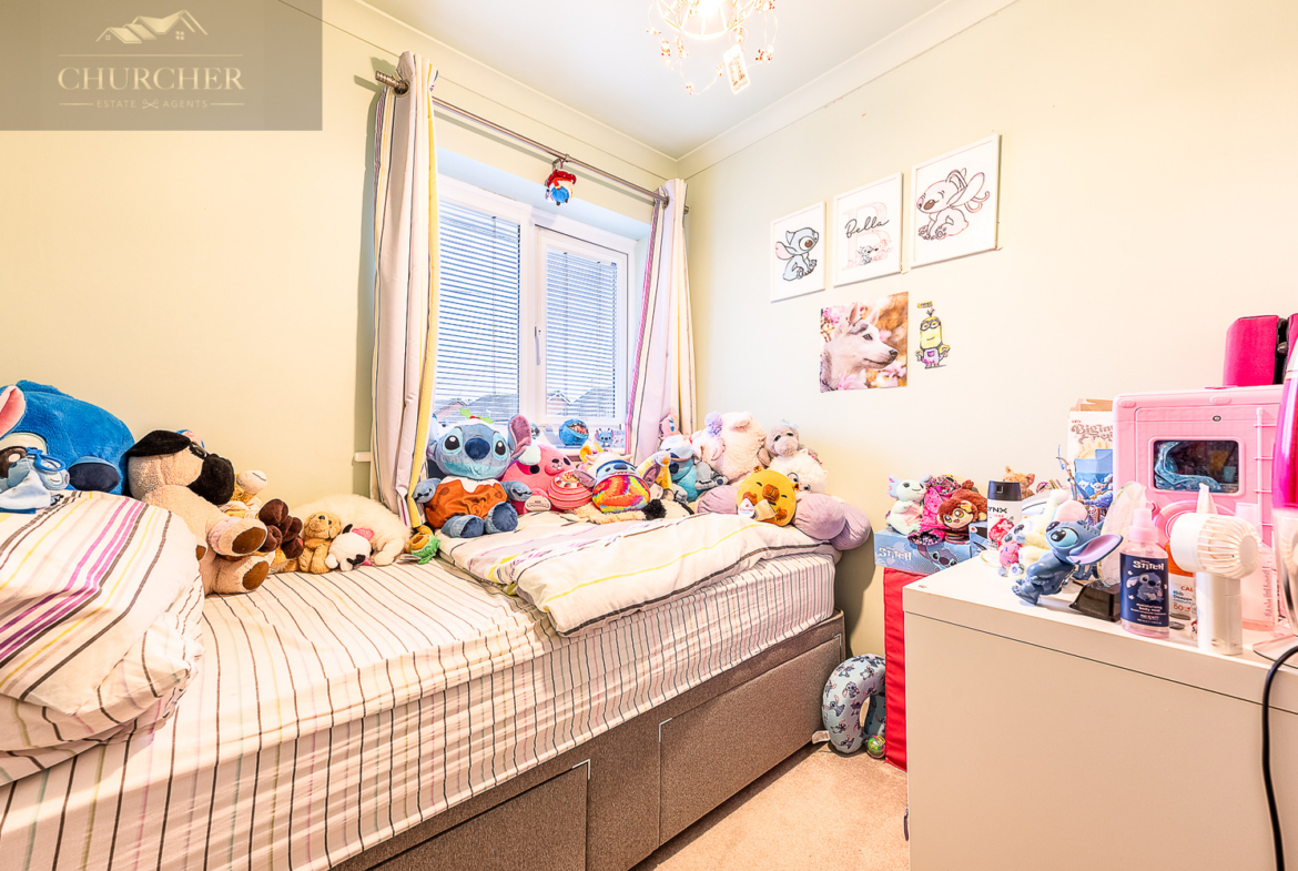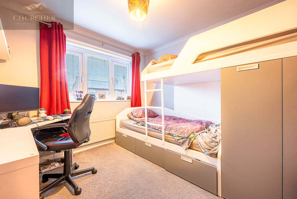 To the first floor, the landing offers access to all three bedrooms and the family bathroom, along with useful built-in storage. The main bedroom is a generous double room positioned to the front of the property and benefits from fitted wardrobes, providing excellent storage while maintaining a calm and uncluttered feel. The second bedroom is another comfortable double overlooking the rear garden, offering a peaceful and relaxing atmosphere. The third bedroom is a well-sized single room, currently arranged as a child’s bedroom, but equally suitable as a home office or nursery.