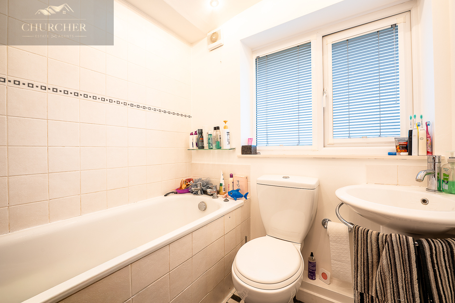 The family bathroom is bright and functional, fitted with a white suite comprising a bath with shower over, wash basin and WC. Neutral tiling and a window for natural light create a clean and practical space for everyday use.