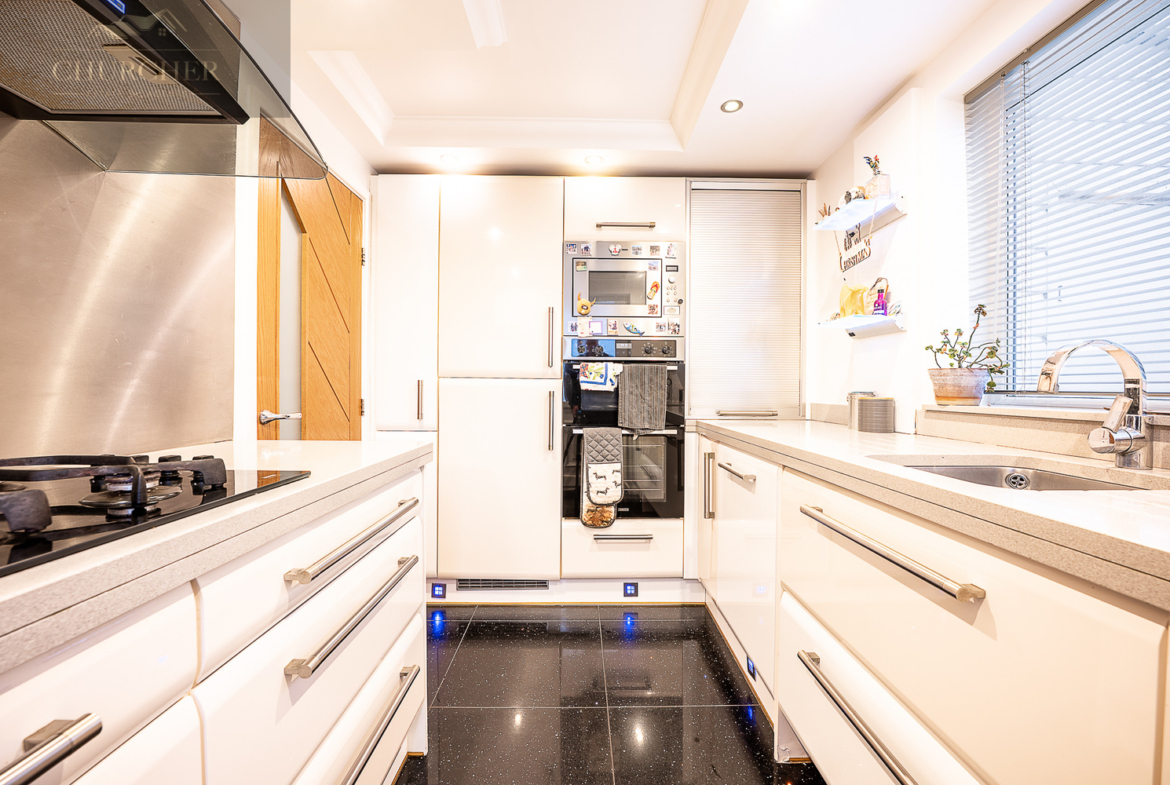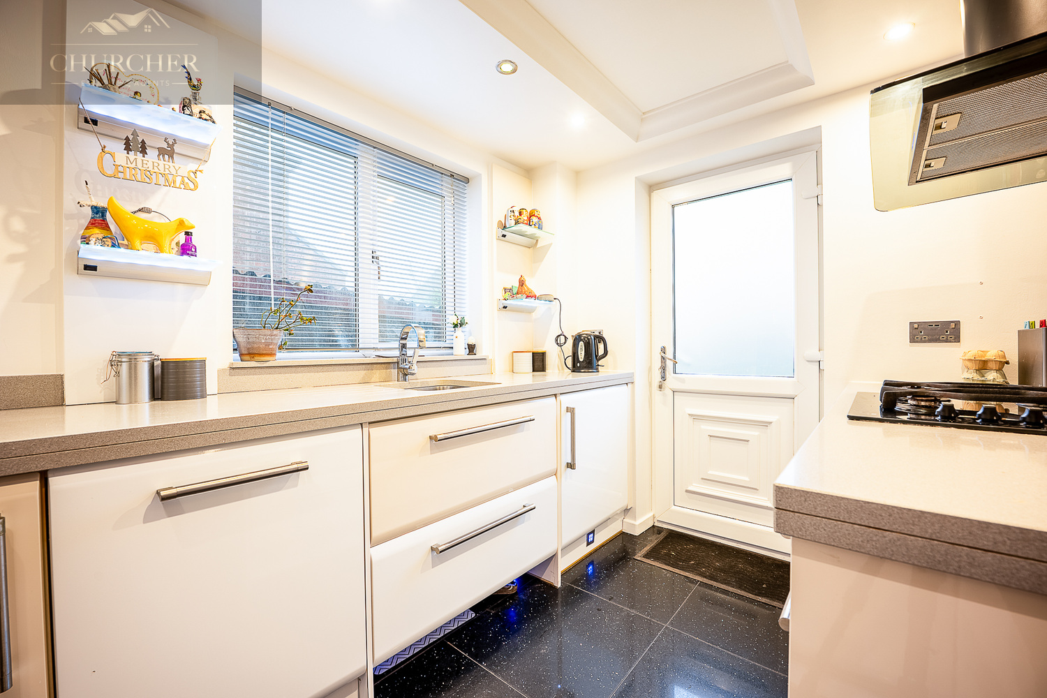 The kitchen sits beyond the dining room and has been thoughtfully designed to maximise both storage and functionality. Finished in a sleek, modern style, it features contemporary cabinetry, contrasting worktops and integrated appliances, complemented by recessed lighting and a stylish tiled floor. A window over the sink brings in plenty of daylight, while a door provides direct access out to the rear garden, making it ideal for day-to-day living and outdoor entertaining.