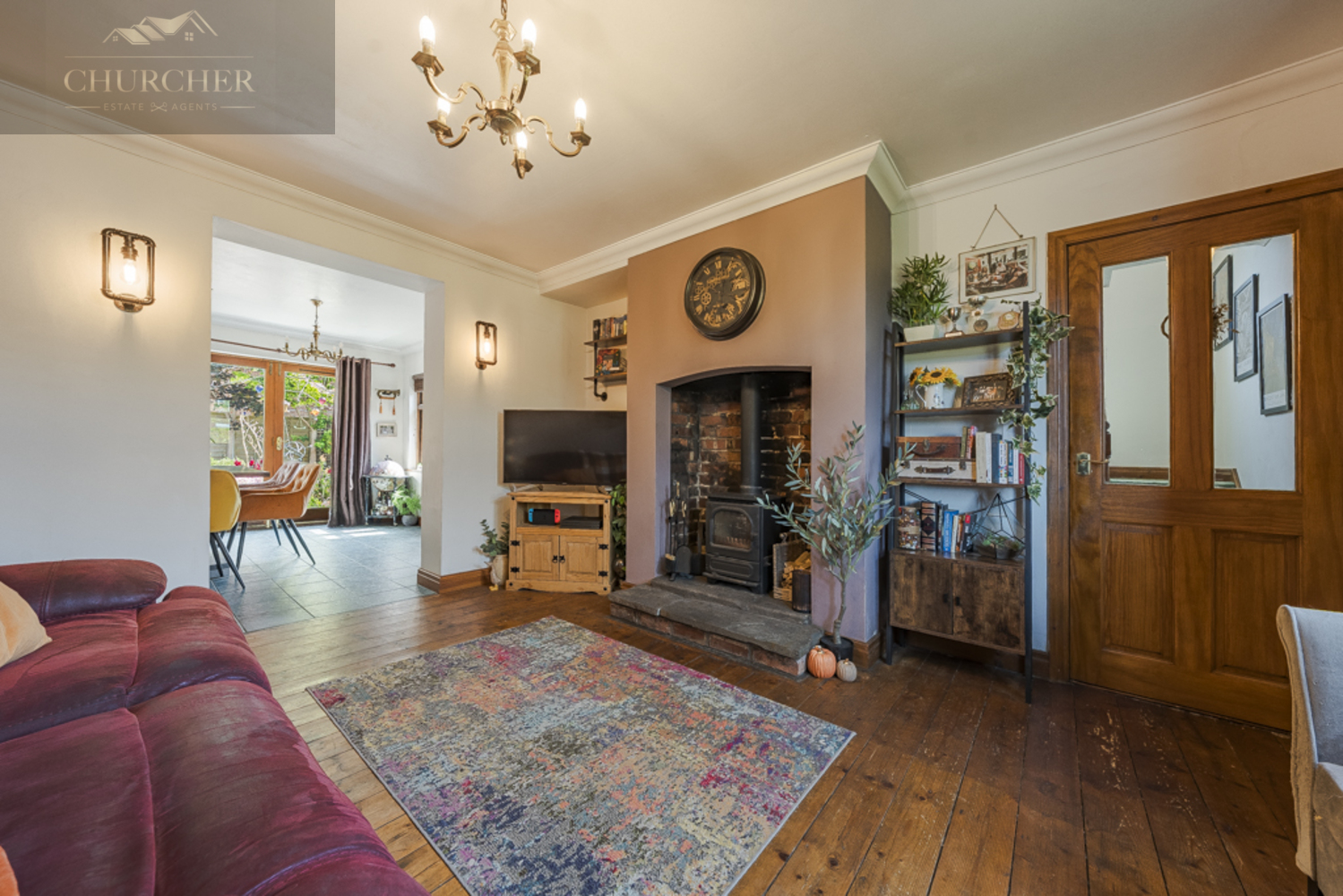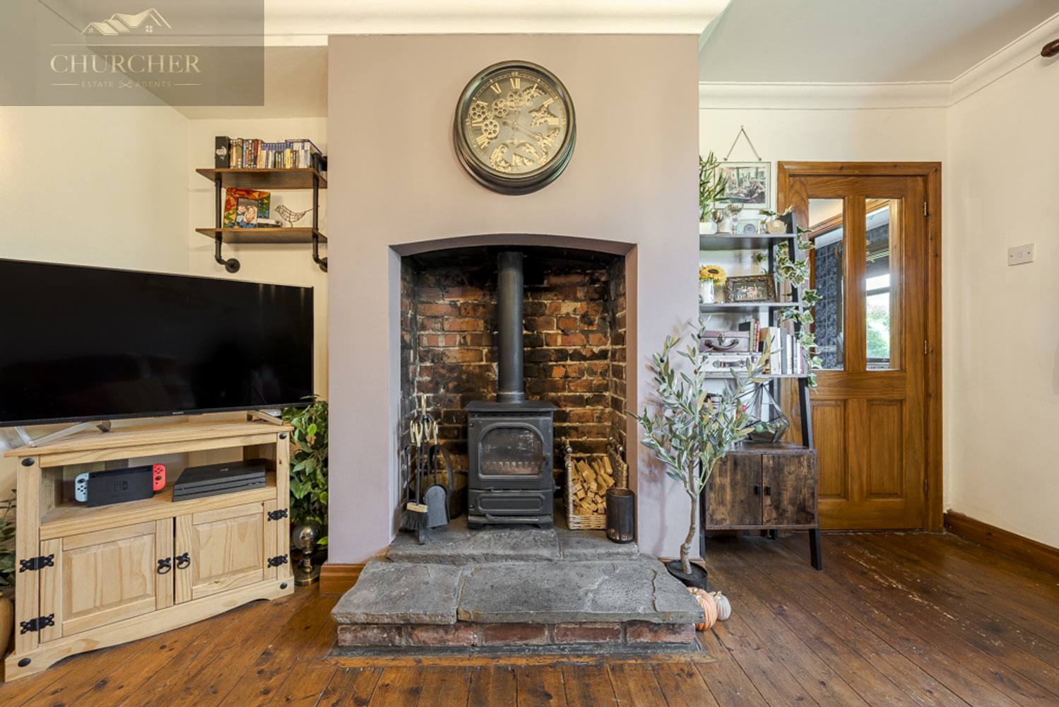 - Cosy living room with original wooden floors, log-burning stove, and exposed brick fireplace